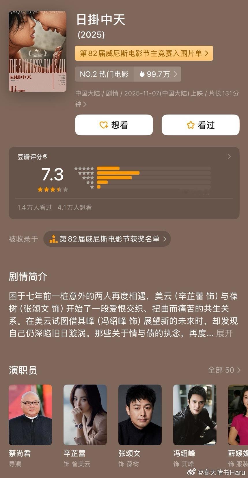 《日掛中天》豆瓣评分7.3分,辛芷蕾凭借此片获得威尼斯电影节影后(其实开分是7.2,现在涨了0.1分)