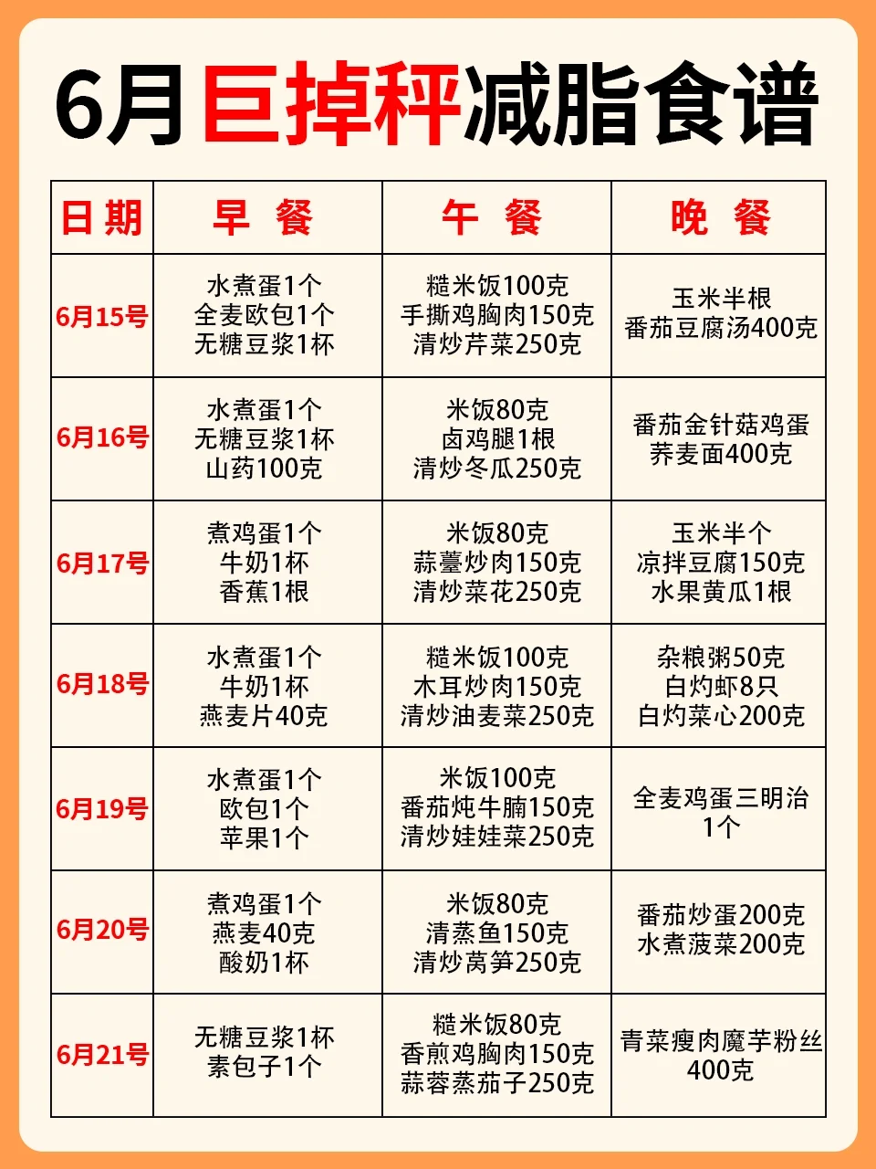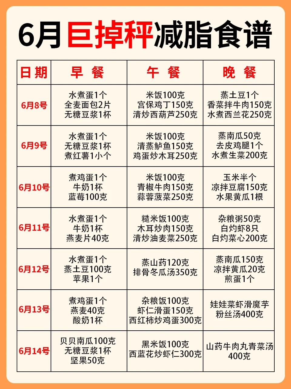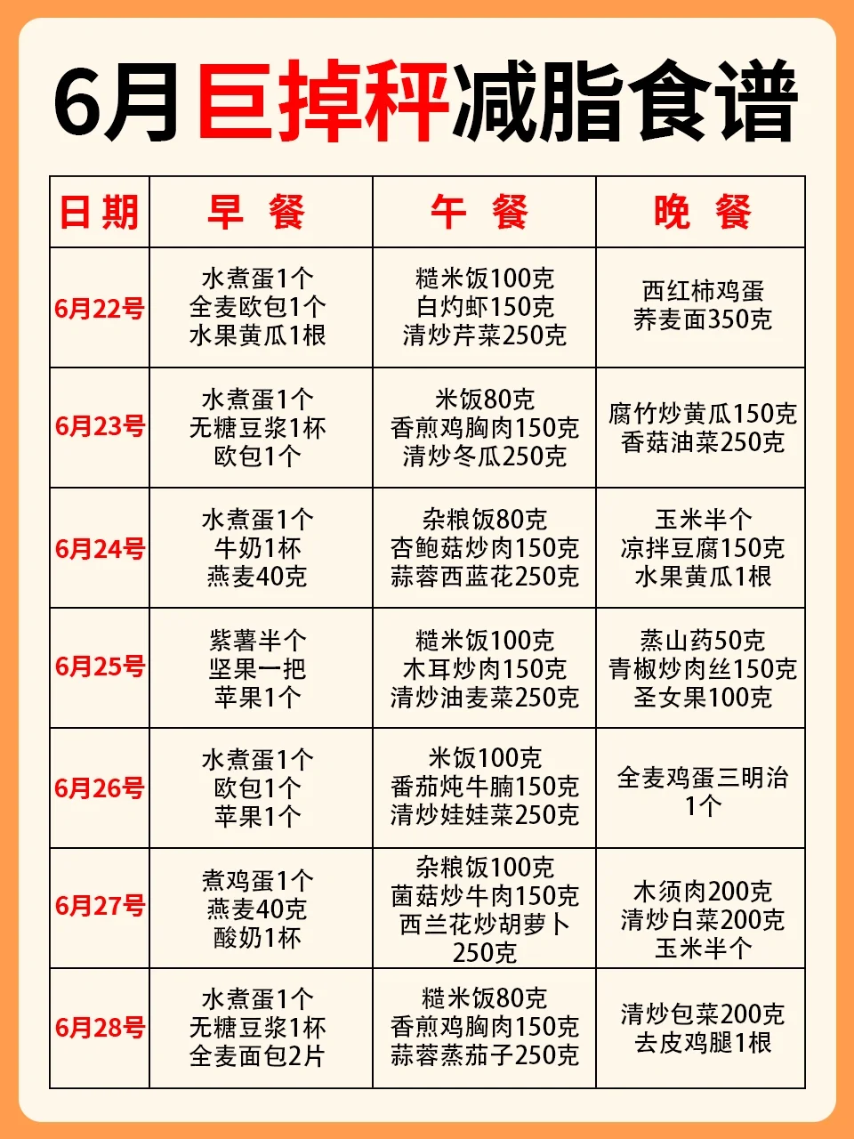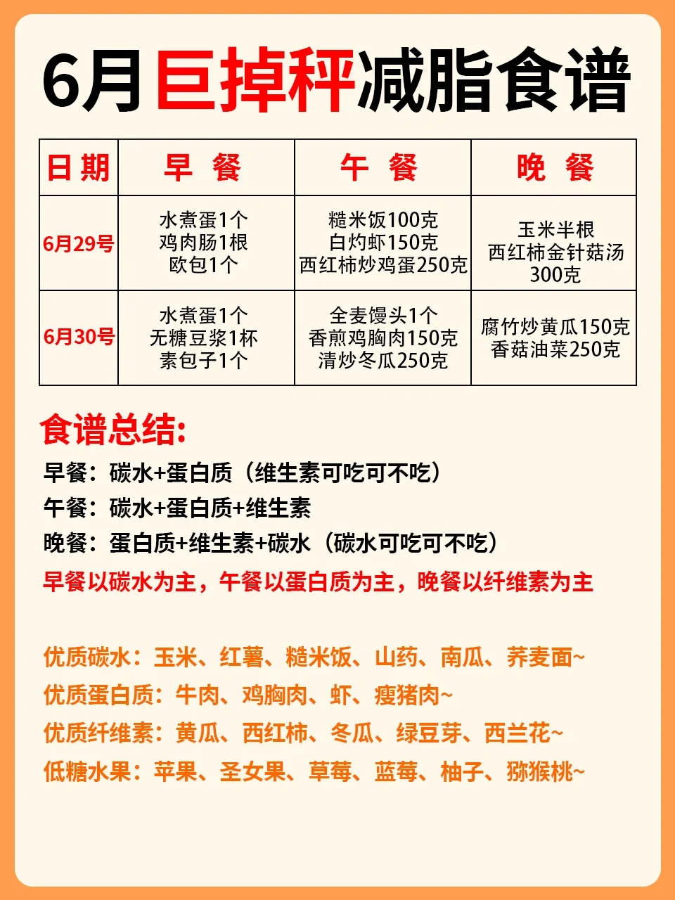 6⃣月减脂食谱来啦,夏天的较量开始啦~ 姐妹们跟着食谱吃起来,好身材吃出来💃 🔥早餐:碳水+蛋白质(维生素可吃可不吃) 🔥午餐:碳水+蛋白质+维生素 🔥晚餐:蛋白质+维生素+碳水(碳水可吃可不吃) 早餐以碳水为主,午餐以蛋白质为主,晚餐以纤维素为主 ✅优质碳水:玉米🌽、红薯、糙米饭、山药、南瓜🎃、荞麦面等 ✅优质蛋白质:牛肉、鸡胸肉、虾🦐、瘦猪肉等 ✅优质维生素:黄瓜🥒、西红柿🍅、冬瓜、绿豆芽、西兰花🥦等 ✅低糖水果:苹果🍎、圣女果、草莓🍓、蓝莓、柚子、猕猴桃🥝等