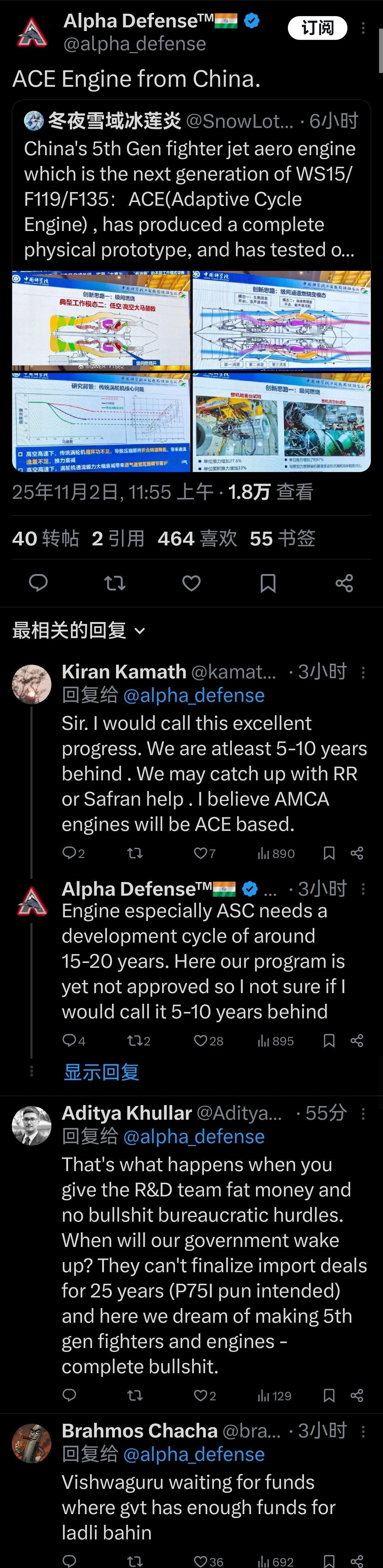 之前东大变循环发动机曝光后最破防的是印度佬 他们甚至有人认为印度军事航空工业距离东大只有5~10年的差距。。连下面的印度军迷都不忍打击他,说至少差距15~20年 东大的第五代变循环发动机已经进行了高空台测试,这对于没有自主研发一款航空发动机的印度来说真实差距是无限大,大到他们绝望 图源推特