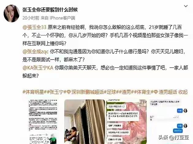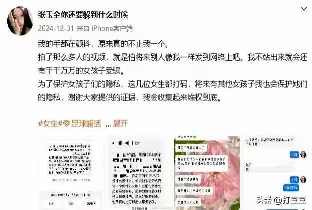女子爆料足球小将张玉全被曝私生活混乱 ,和几百名女子有染! 私生活这个事纯属个人作风问题,按说我们旁人不应该多说,但回想,几百万的年薪,比赛中的成绩,还有场边呐喊的球迷,多少有点心寒! 前段时间再看苏超,不一定是多高的竞技水平,但他们对足球的热爱,拼搏精神对得起球迷的追捧!