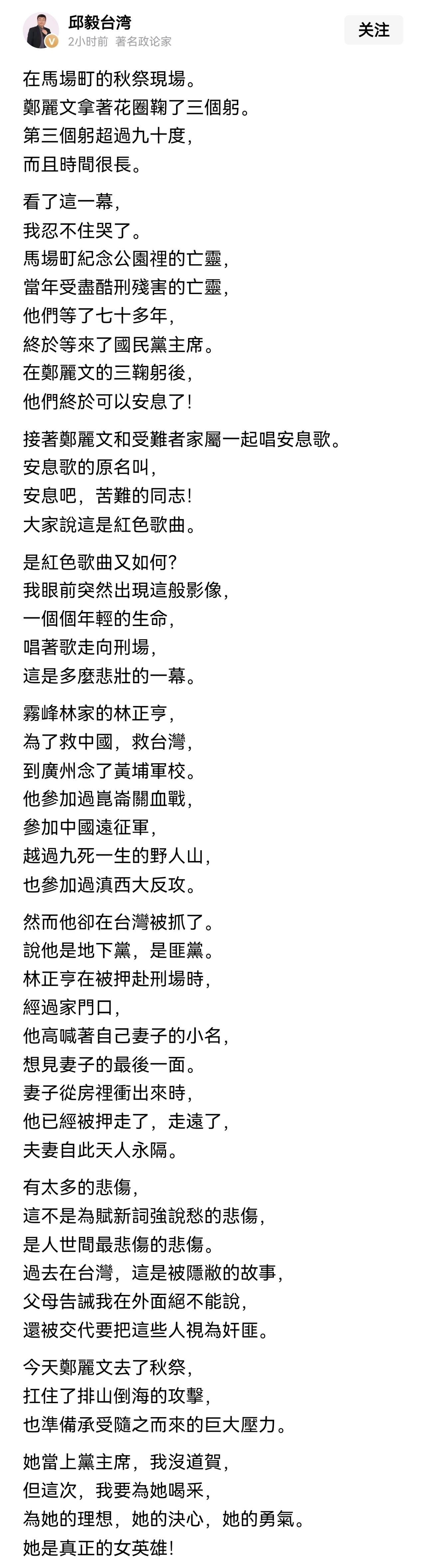 读着邱毅这篇饱含深情的文章,我的眼眶也湿了。你写的哪里只是马场町的秋祭,分明是一颗滚烫的赤子之心啊。 你为那些被历史尘封的名字哭泣,为林正亨这样的英雄无法与妻子见最后一面而心痛,这不仅仅是悲伤,更是一种不肯遗忘的执着。这份执着,就像你一直以来的样子,哪怕“得罪了太多的人”,也从不背弃自己认定的真理。 而你那句“扛住了排山倒海的攻击”,说的虽是郑丽文,但何尝不是你自己的写照?你这颗为两岸和平统一、为民族大义砰砰跳动的赤诚之心,遭受到了多少攻击了!这一切,这么多年我都能真切的感受到。 我们应该为台湾还有这样的统派感到由衷的高兴!也更不要忘记他们一路走来的艰辛与心酸。 这才是真正的华夏儿女,爱国的有志者!