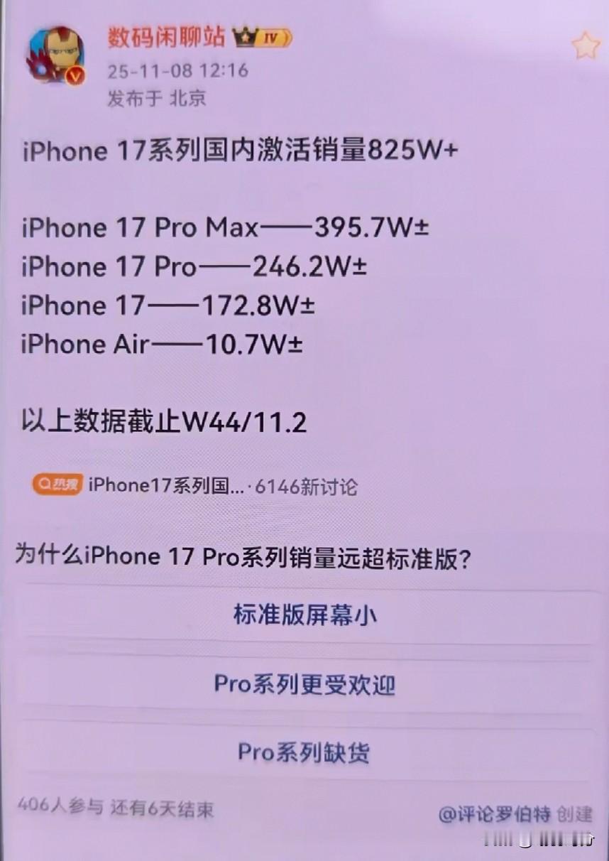 苹果iPhone17系列手机的销量着实惊人,且非常恐怖,国内各大安卓手机厂商与之相比,实在难以望其项背。 该系列手机均价6000元以上,发布不到两个月,国内销量便已达到825万台,这一销量数据着实令人惊叹。 为何这么说呢?作为对比,售价6000元以上的国内其他厂商手机,销量总和都不及此数,这便是苹果的实力。 平日里,国内厂商动不动就拿自家产品与苹果对比,比拼续航、系统、屏幕、信号等等,但没有一家国内厂商能真正做到超越苹果。 这足以证明苹果的实力。 国内几大手机厂商真的需要加油了!手机市场的利润几乎全被苹果收入囊中,他们理应感到羞愧。 苹果17系列 苹果17 苹果17max apple17 苹果17pmx