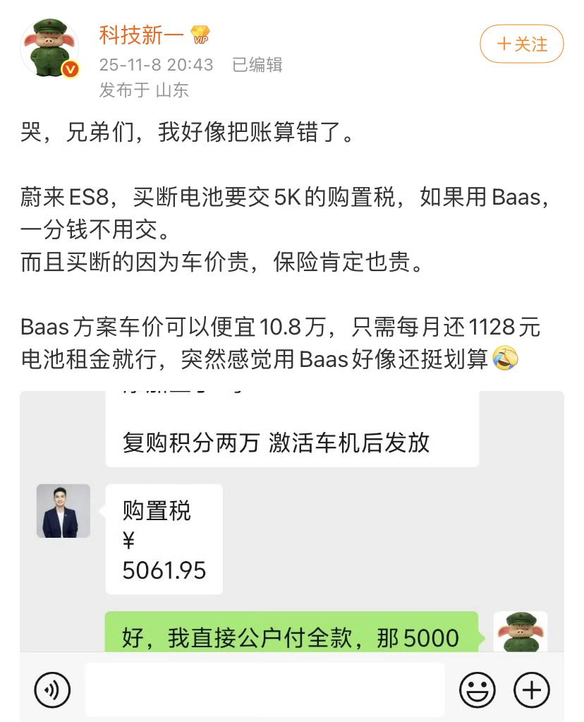 科技新一:兄弟们,我好像把账算错了! 原因是买车的时候没有采用电池租赁方案,如果采用电池租赁方案的话,那么购置税就省了。 还有一点是因为如果电池是租赁的,那么也就意味着保险的费用更低,这样算下来其实还是挺划算的。 负责电池租赁业务的蔚能为每块电池都额外买了保险,也就是说你把这块电池给撞报废了,你也不需要赔偿。 各位是怎么看的?欢迎评论区留言。