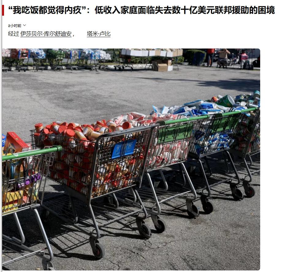 4000万美国人被一纸裁决“断粮” 当数千万美国人都指望着食品券维持温饱的时候,美国最高法院一纸裁决击碎了他们的希望。 8日美国有线电视新闻网报道了联邦政府持续停摆对美国经济民生造成的影响,包括超过1000多个航班延误或被取消、食品券暂停发放等等。 报道援引美国农业部的数据指出,目前平均每月约有4000万美国人领取并依靠食品券维持温饱,但7日美国最高法院作出裁决,允许特朗普政府可以暂停发放约40亿美元的食品援助资金。 美国最高法院作出这一裁决的原因,依然与党争有关。特朗普政府最初计划暂停11月的全部食品券福利,之后又改口仅支付部分援助资金,因此民主党任命的罗德岛州地方法院法官约翰·麦康奈尔裁决特朗普必须动用其他项目的资金全额支付本月的福利,最终官司打到了最高法院。 究其本质,这场闹剧源于美国政治的结构性矛盾。联邦政府停摆本可以通过妥协避免,但如今两党都将打击对手置于民众福祉之上,宁愿让4000万人挨饿,也不愿承担政治让步的代价。 对于这些依赖食品援助过日子的美国人来说,两党的党争已经影响到他们的基本生存。 美国有线电视新闻网披露了一家救济机构负责人看到的情况:“凌晨4点就有很多人在排队等待领取救济,这已不只是一场危机……你能看到、感受到这些人的绝望和沮丧。” 这一幕可以说是对美国“人权祖师爷”最绝妙的讽刺。