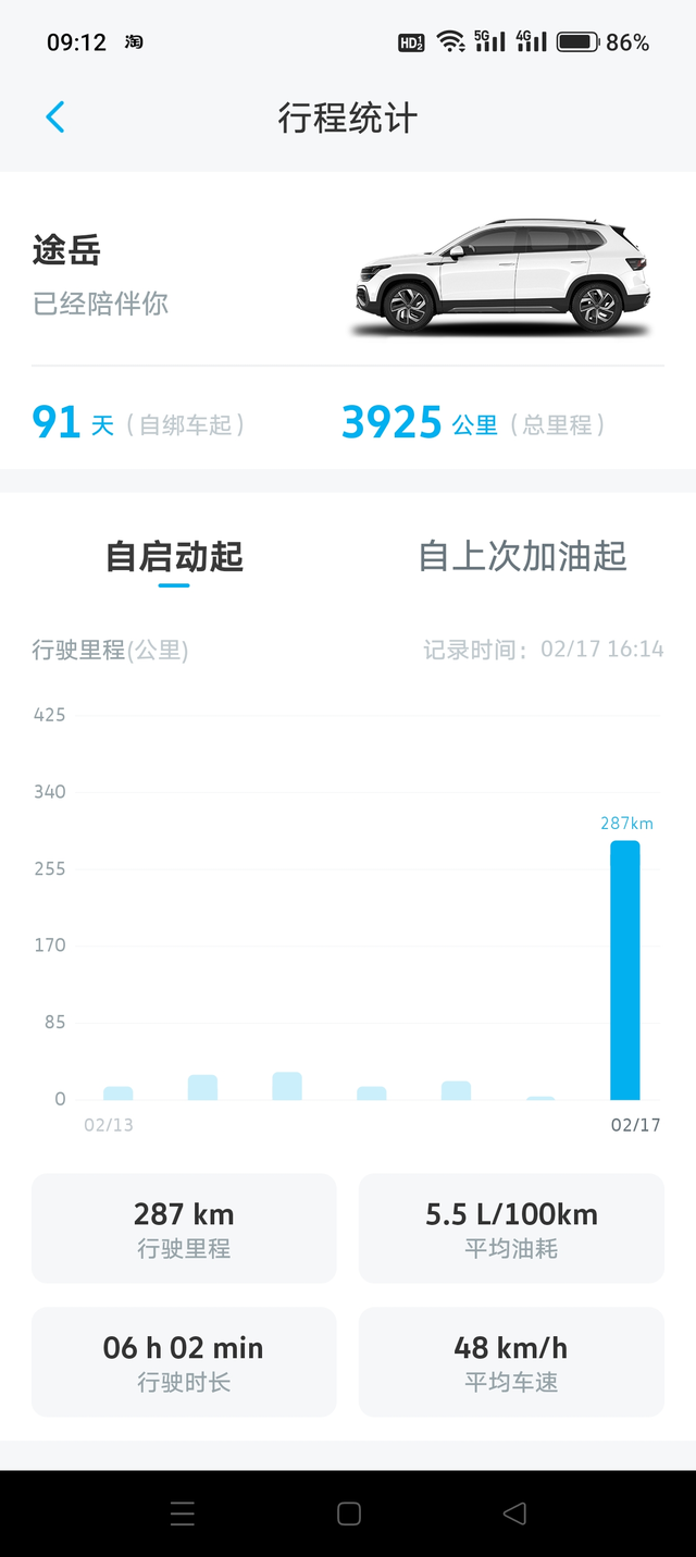 途岳皎月版油耗分享 买车已经有90多天了,跑了快四千公里了,200多公里是高速,60公里是农村小路,共5.5个油,个人感觉还可以,毕竟是新手,如果是全跑高速可能还会到5左右,这款车还是推荐跑高速。
