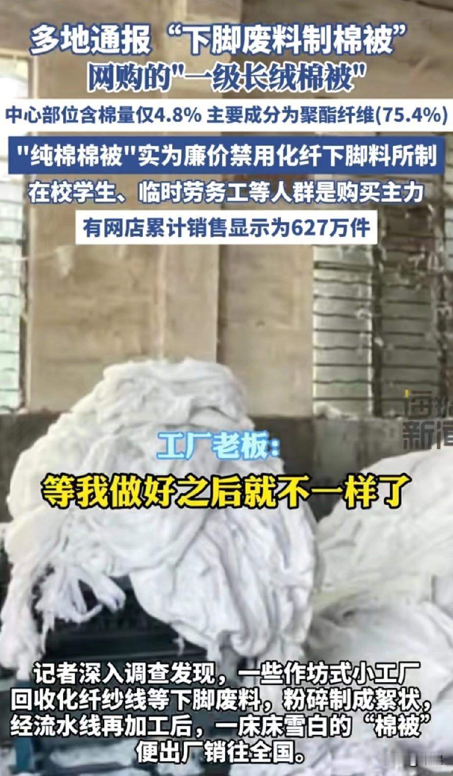 纯棉标签过后, 又一避雷产品。 网购平台上的 “一级长绒棉被”“纯棉棉被”, 有些是用禁用化纤下脚料加工成的。 检测显示,所谓的长绒棉被中心含棉量仅4.8%,核心成分是聚酯纤维。 然而部分“纯棉被”实际是回收的化纤废料粉碎再加工的产物。 这些成本低至5元/斤的劣质棉被,价格不到长绒棉的五分之一。 在校学生、临时劳务工等人群是购买主力,有的网店累计销售显示为627万件。 商家为逐利践踏底线,用废料冒充优质棉被。让消费者蒙受经济损失的同时更可能危害健康。 低价不是劣质的借口,监管部门应加大排查力度,从生产源头到销售终端筑牢防线。 消费者也要提高警惕,一分钱一分货假不了,不要因为贪便宜陷入低价陷阱。 棉面料 家纺黑心棉 高密度长绒棉 黑心棉厂家 新疆有机长绒棉 黑心棉被厂家 黑标棉 水洗棉羊毛被 长绒棉布 新长绒棉 纺织品质量标准