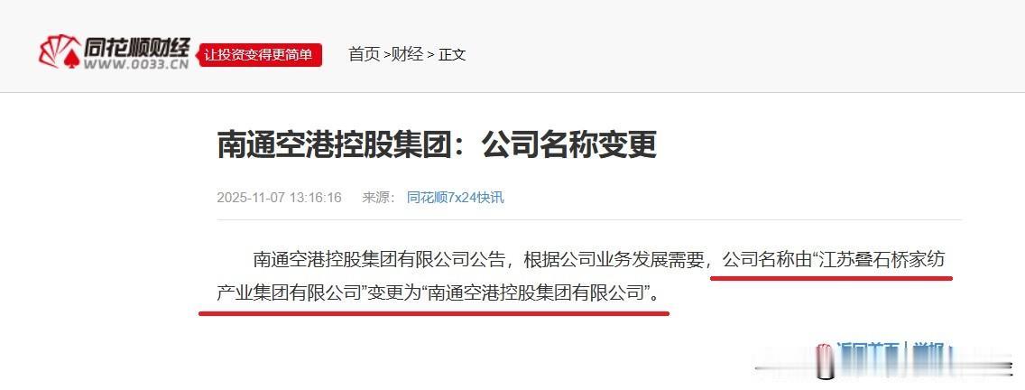 冷不丁跳出一条财经新闻:南通叠石桥家纺产业集团,更名为”南通空港控股集团“。跨度有点大,有点突然,是不是好事将近了?