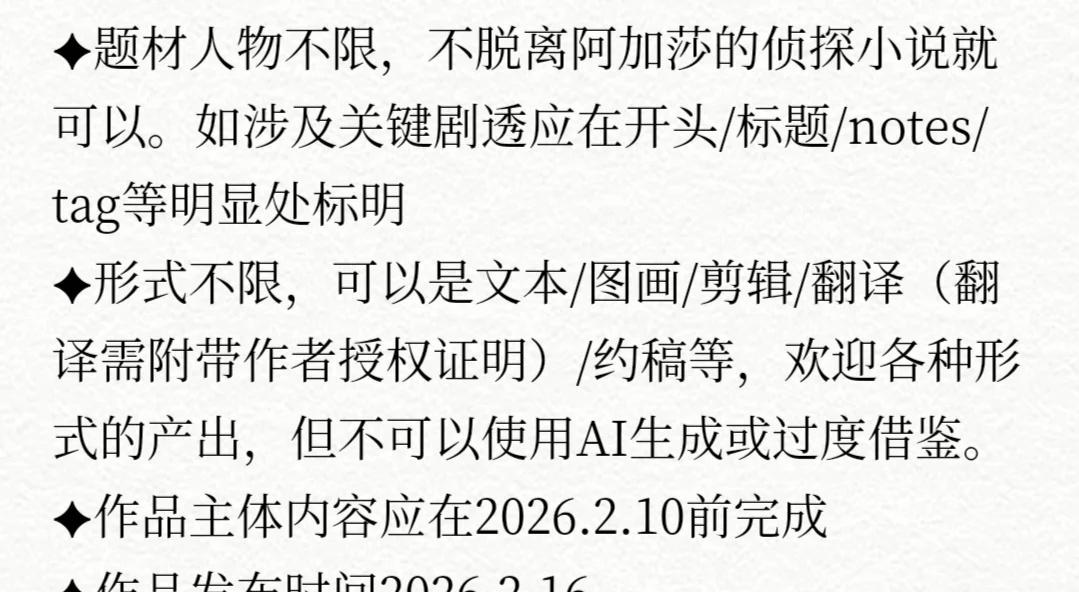 听说阿加莎克里斯蒂要上春晚了? 阿加莎新春同人接力招募!!!让阿婆同好拥有自己的春晚!!参与基本信息见图,有意来参加的速速,准备时间完全充足! 单纯想凑热闹看同人的请来:95个吉拉德带着971位警官找到了281个证物最后得出0条线索惜败赫尔克里波洛 阿加莎克里斯蒂 推理 罗杰疑案 波洛 马普尔小姐 名著同人 无人生还 谋杀启事