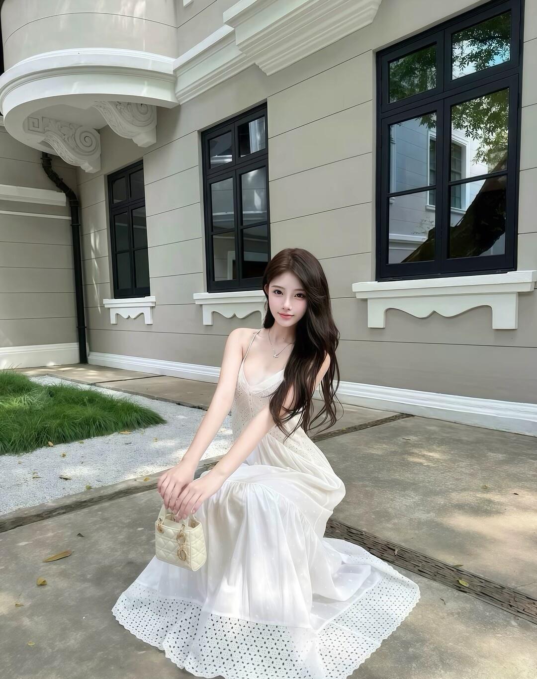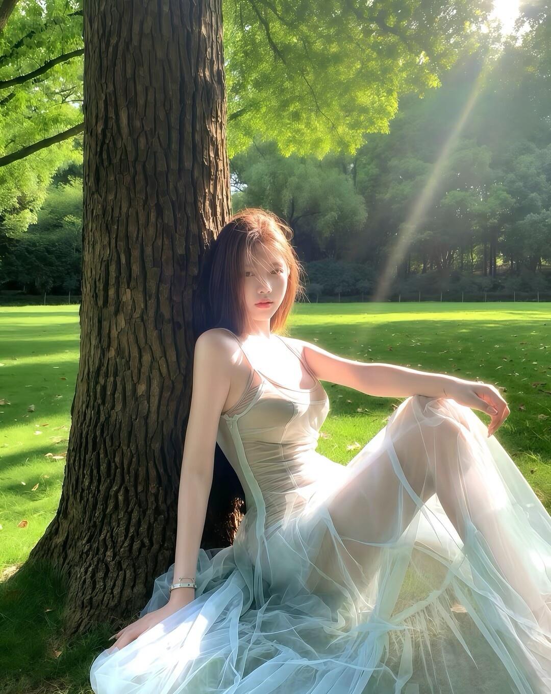 阳光下的甜美少女,浅蓝色连衣裙,微笑动人。