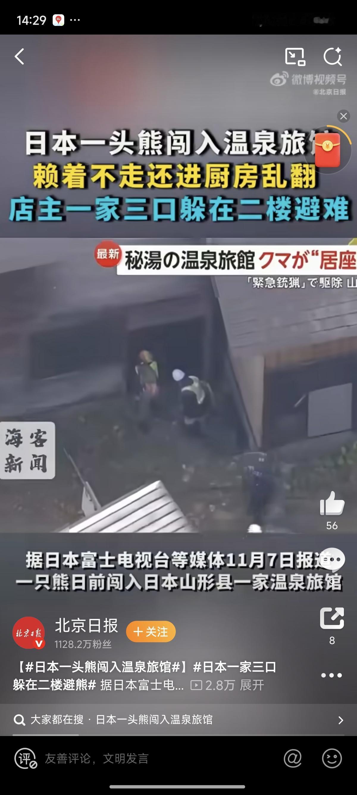 这熊也太嚣张了!日本山形县一家温泉旅馆被一头熊“霸场”,赖在一楼厨房乱翻,锅碗瓢盆扔了一地,店主一家三口吓得躲在二楼不敢下来! 最后这头熊被当地政府捕杀了,可今年日本已经有13人遭熊袭击死亡了… 咱就是说,这野生动物和人类的距离也太近了吧! 你遇到过野生动物闯入人类区域的情况吗?来评论区聊聊~日本熊袭 日本熊伤人 东京熊