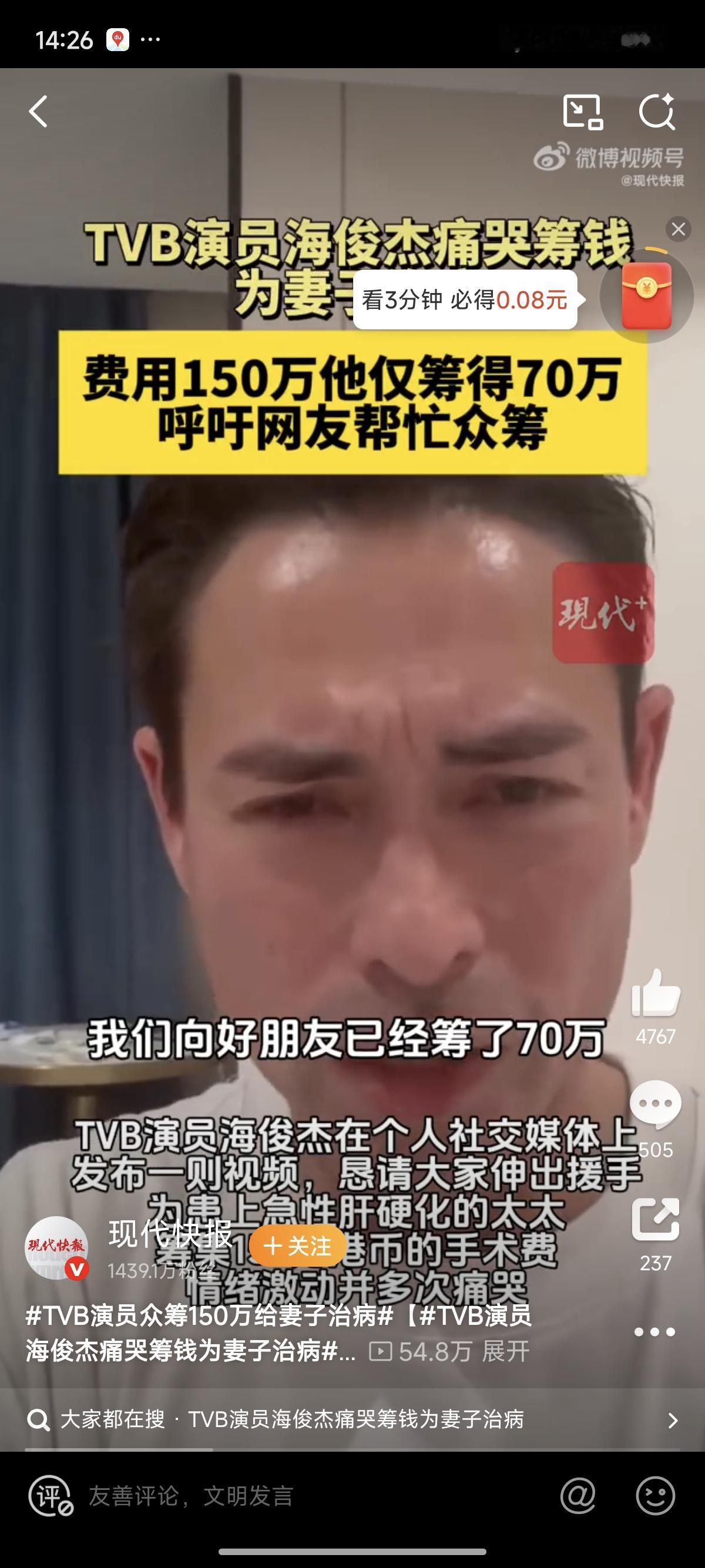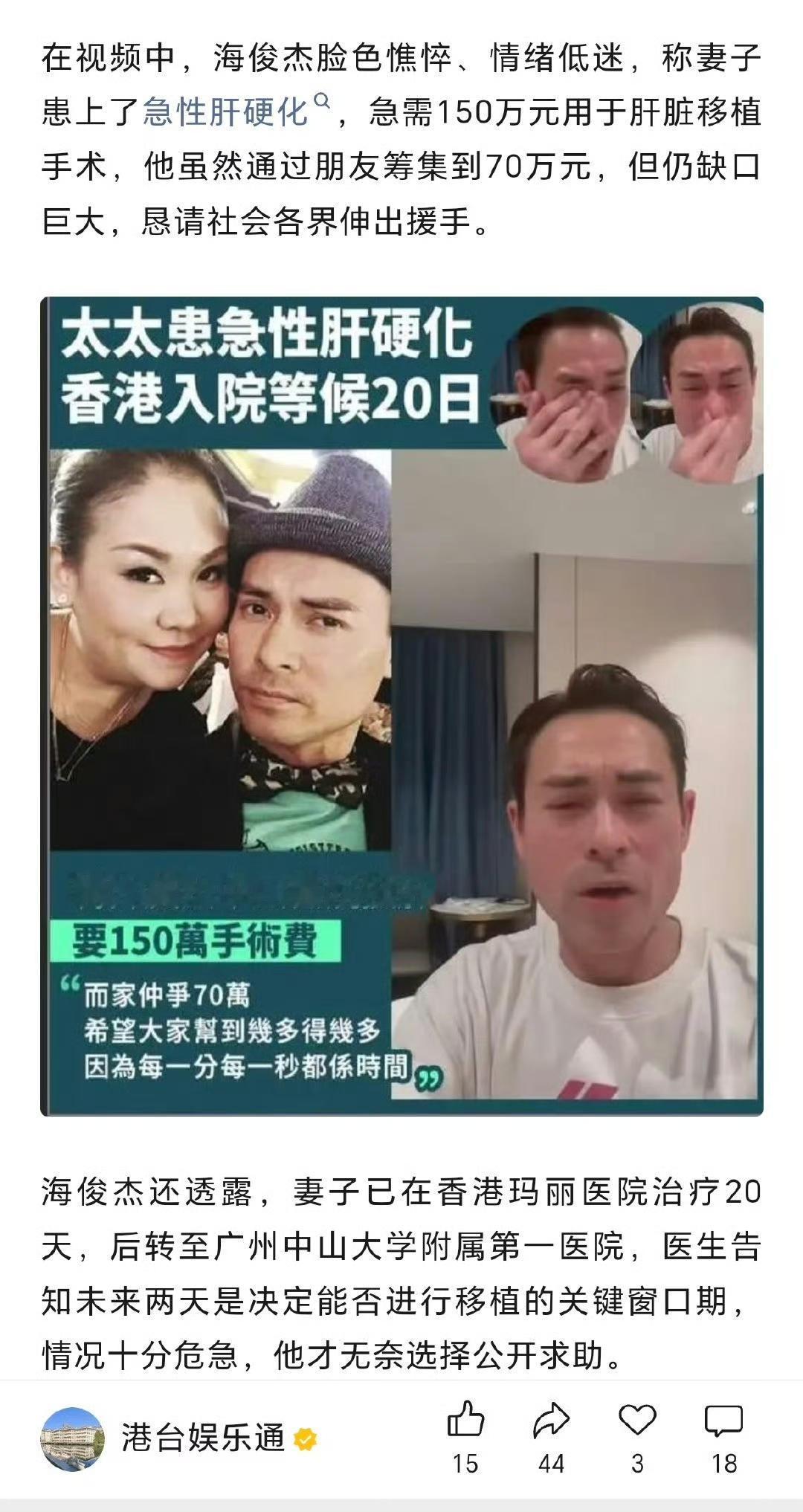 看哭了!TVB老戏骨海俊杰深夜痛哭求帮忙,只为给患急性肝硬化的太太筹肝移植手术费! 11月8日晚10点,他在社交平台发视频,眼含热泪说“我不是骗子”,目前筹到70万港币,离150万的目标还差一大截,而医生说这两天是手术关键期! 海俊杰演过《倚天屠龙记》《法证先锋IV》,在TVB摸爬滚打这么多年,如今为了妻子放下尊严求助,真的太让人心酸了。 大家觉得这种明星众筹该支持吗?来评论区聊聊~TVB