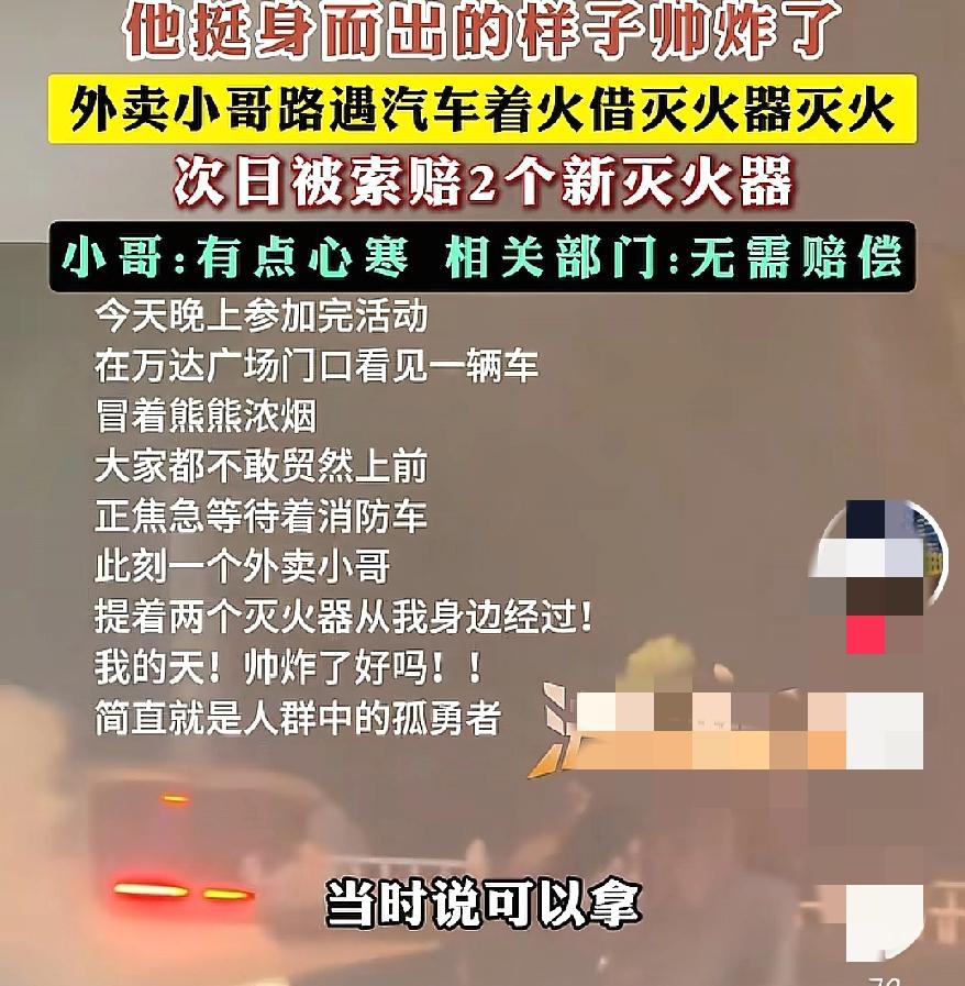 外卖小哥见义勇为 超时罚单100多 换一条可能被挽救的生命,这波“亏本买卖”做得太值了! 据他自己讲,之前是特警,看到路边车辆起火,别人围观不敢上前的时候,他拎着两个灭火器就冲了上去,耽误送餐导致五个订单超时赔钱,却连句后悔都没有。 后续也挺暖心,警务室知道了情况,免去了灭火器的赔偿,顾客们纷纷表示理解,平台也在处理他的外卖延误申诉。 法律早就明确受益人该为见义勇为者补偿,可现实里能让好人毫无顾虑出手,靠的还是这份双向奔赴的温暖。 你觉得平台该给这样的小哥额外奖励吗?来评论区聊聊~外卖员超时送餐 送外卖事故 外卖
