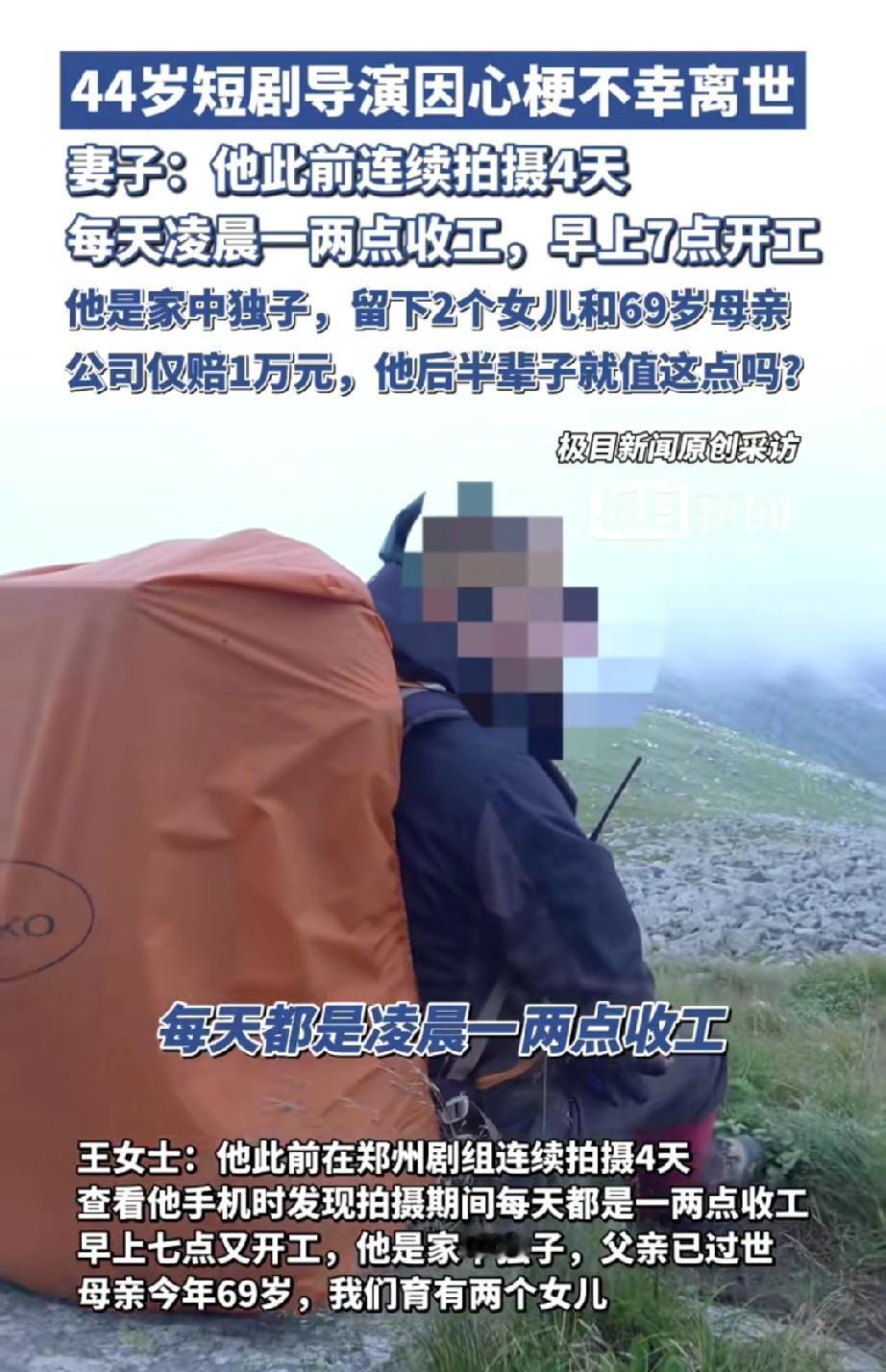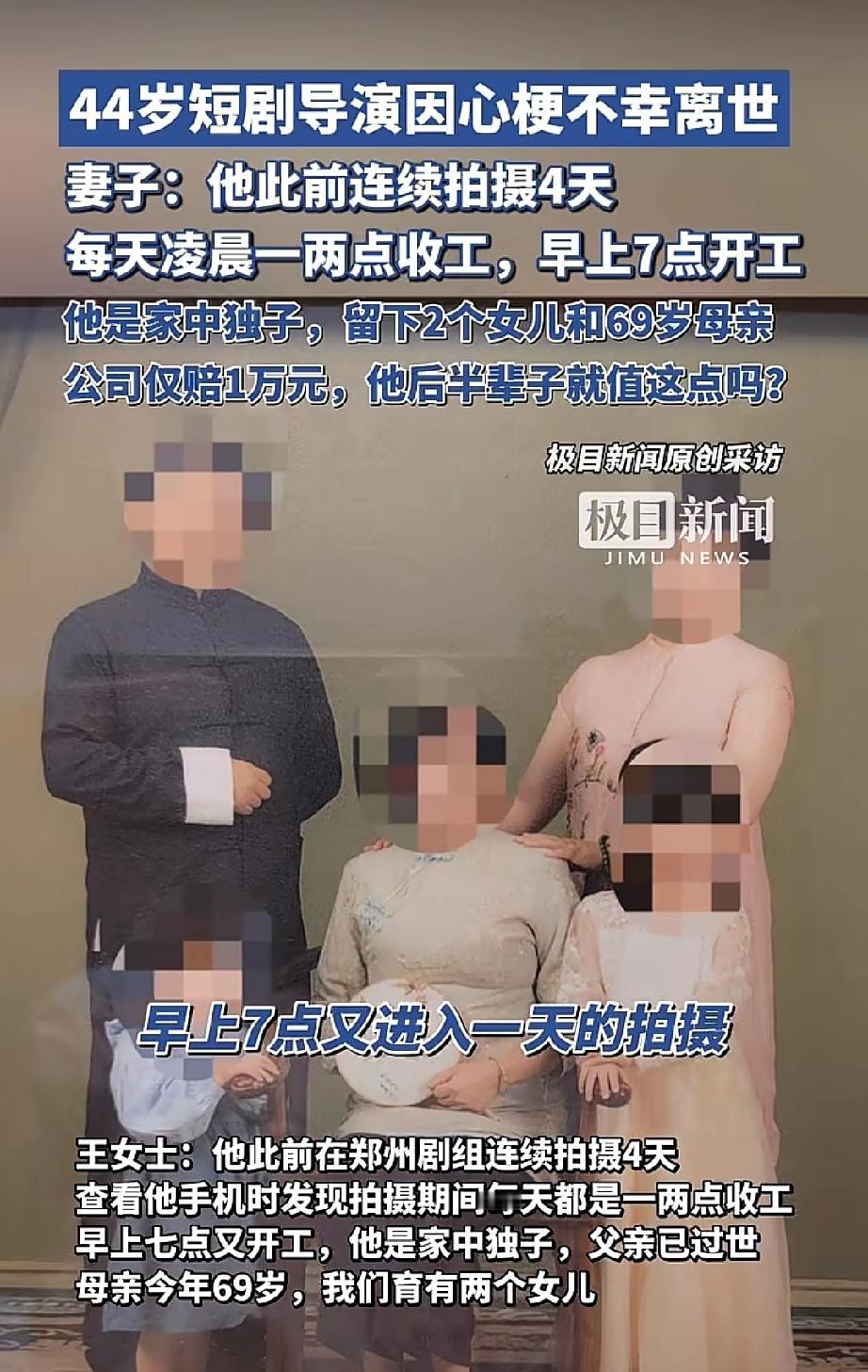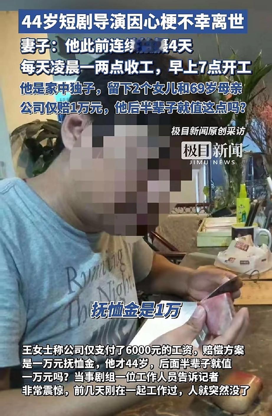 生命没有返程车票,健康也无替代品。 河南郑州,44岁短剧导演唐某于10月20日在家中猝死。短剧公司仅愿支付6000元工资和一万元补偿金,妻子心疼不已,质问道:“他的下半辈子,只值这么点钱吗?” 唐某并非专业导演出身,凭借对导演工作的热爱自学成才,于今年五月投身短剧拍摄行业。 此次拍摄计划为期四天,唐某每日清晨七点便前往剧组,直至凌晨一两点才下班。 去世当天中午,他还在微信上处理工作事务。 不知唐某是以临时工身份入职短剧公司,还是签订了劳动合同。 但短剧公司仅给予一万元赔偿金,实在太少,这更是对生命的漠视。 唐某骤然离世,令妻子悲痛万分,同时她也忧心唐某70岁的老母亲和两个年幼女儿未来的生活。 演员戴娇倩曾在媒体上提及,她认识的一位导演连续工作七天后,因心肌梗死离世。在影视行业,导演和工作人员每天仅睡三四个小时是常有的事。她曾呼吁:“同行们,没什么比命更重要,大家保重。” 然而,没人重视戴娇倩的呼吁,导演和工作人员只想加班加点完成工作任务,毕竟投资商提供的资金成本有限。 从唐某的照片可以看出,他体重已然超标。在高强度工作压力下,加之熬夜、饮食不规律、缺乏锻炼,才酿成了这样的悲剧。 珍视生命是一种态度,重视健康是一种行动。两者兼具,方能穿越岁月风雨,拥抱充满烟火气的生活与远方。 来源:极目新闻