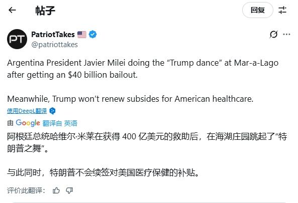 “记上,阿根廷总统米莱为特朗普跳舞”   前有尹锡悦为拜登唱歌,现有阿根廷总统米莱为特朗普跳舞。   当地时间11月6日,阿根廷总统米莱开启了他上任后的第14次访美之行——简单来说,就是又去找特朗普慷慨解囊了。   不出意外,这回米莱再次收获颇丰。他将原先美国对阿根廷货币汇率稳定救助方案从200亿美元争取提升到了400亿美元。   所以,异常高兴的米莱,在海湖庄园的演讲结束后,伴随着特朗普的专属配乐(《YMCA》),情不自禁地当场开始跳舞,尽显作为“特朗普头号粉丝”的狂热。   然而,与当晚海湖庄园热烈气氛形成鲜明对比的是,目前美国联邦政府已经停摆超过一个月的时间,超过4000万依赖食品券度日的美国民众正面临“断粮”的威胁。   一边是阿根廷获得巨额资金援助,海湖庄园的歌舞升平,另一边却是美国无数家庭为基本温饱发愁,这一幕可以说是相当讽刺了,同时也鲜明地揭示了特朗普某种政策优先级的错位。   要知道,特朗普可是一直高喊“美国优先”,但如今美国人正急需帮助时,他的“美国优先”却变成了“盟友优先”或者“利益优先”。