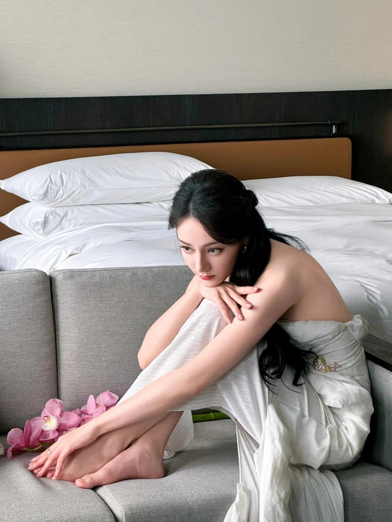 迪丽热巴 | 红唇白裙 光脚丫写真