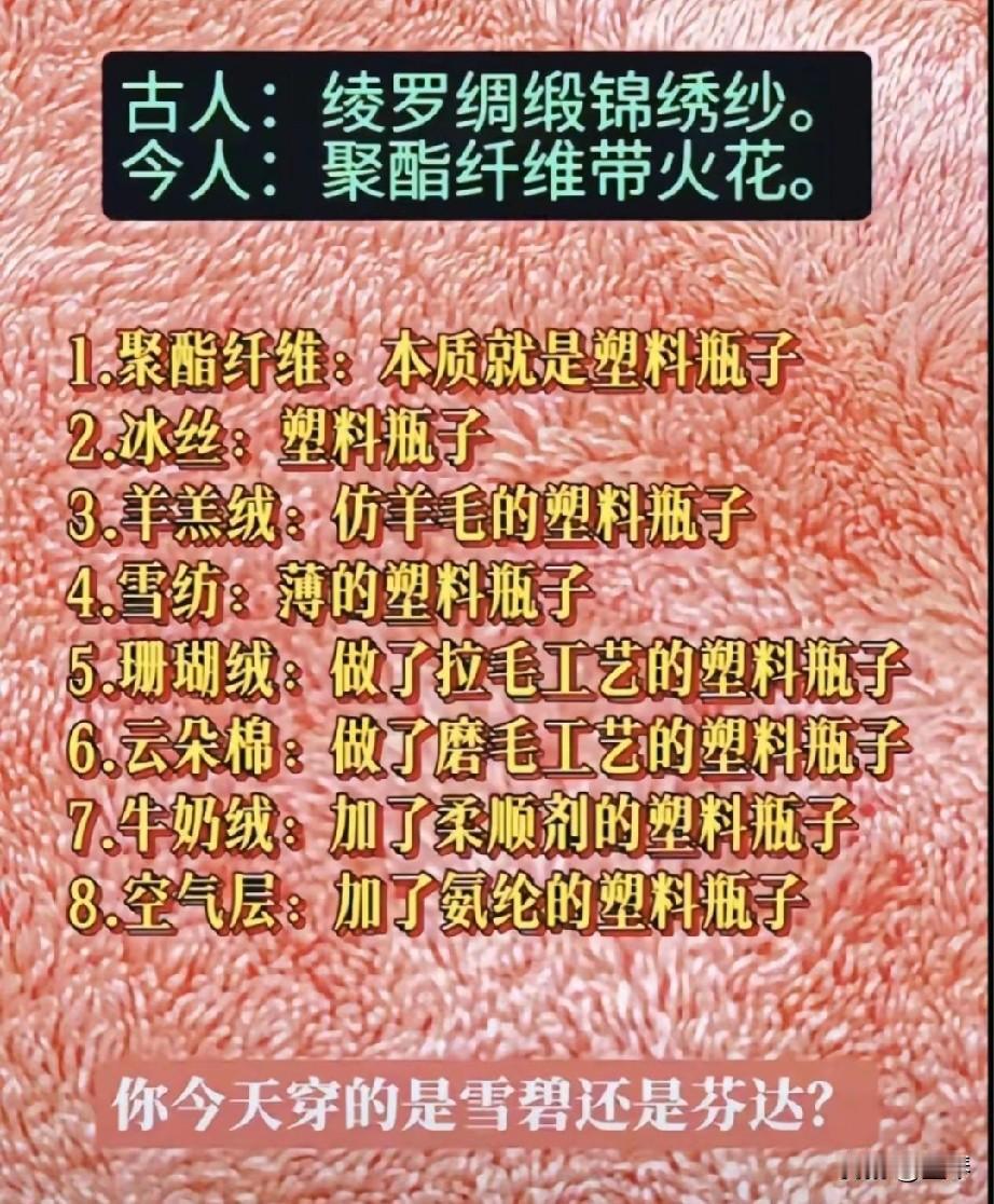 别再被“云朵棉”骗了!我们穿的“高级面料”,其实是… 前几天刷到个段子给我整乐了: 古人穿绫罗绸缎锦绣纱,今人穿“聚酯纤维带火花”。 更扎心的是下面的清单—— 冰丝=塑料瓶子,羊羔绒=仿羊毛的塑料瓶子,雪纺=薄的塑料瓶子… 合着我这一身,是“雪碧瓶改的外套+芬达瓶织的裤子”? 有朋友吐槽:“以前穷能穿棉花,现在吃饱了却穿不起棉”。 其实真不是“不配”—— 咱们国家棉花产量常年稳居世界前列,平价纯棉T恤、内衣也就几十块,超市里10块钱的纯棉袜子满货架都是。 化纤面料的普及,从来不是“取代棉”,而是补全了棉做不到的事: 运动衣要速干(棉会闷汗)、冲锋衣要防水(棉一湿就重)、打底衫要弹力(棉没这劲儿)… 现在的我们,既能选纯棉的软和,也能选化纤的实用,明明是“有的选”,不是“没得选”。 让人糟心的是:商家总给塑料瓶子起“艺名”—— “云朵棉”“牛奶绒”“空气层”…听着像把云朵裹身上,一看成分表:还是那熟悉的“聚酯纤维”。 但咱有招治它:认准衣服内侧的“成分标签”—— 只要标了“100%聚酯纤维”“棉50%+聚酯纤维50%”,那是明明白白; 要是把“聚酯纤维”吹成“天然植物纤维”,直接反手一个举报(这叫虚假宣传)。 其实想开了,“塑料瓶面料”没那么不堪:它便宜耐造,几十块的外套能穿一整个冬天; 它轻便速干,运动时比纯棉舒服十倍; 甚至很多“环保面料”,本身就是回收塑料瓶做的(既省钱又减碳,算双赢?)。 咱们不用抵触化纤,也别被“高级名字”忽悠—— 想舒服选棉,想耐磨选化纤,看标签买,谁也糊弄不了你。 最后弱弱地问一句: 你今天穿的是“雪碧瓶”,还是“纯棉衫”? (评论区晒晒你的衣服成分,看看谁是“塑料瓶大户”) 你觉得存钱和买保险哪个更靠谱塑料 服装