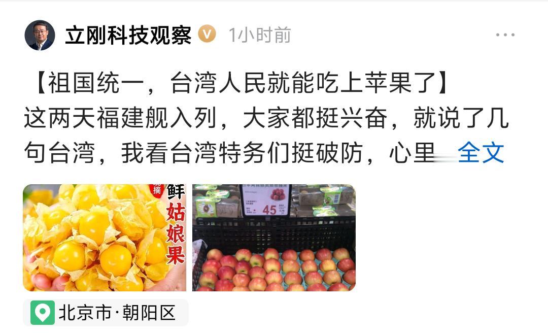 项立刚太不严谨了,他竟然说,祖国统一,台湾人民就能吃上苹果了!现在台湾没有苹果吃吗?非也!台湾人民想吃便宜的大陆苹果吗?也不一定!也就是说,他们中的很多人,如赖清德、萧美琴、沈伯洋之类的,哪怕大陆苹果1块钱一个,他们也是宁愿吃10块钱一个的美国苹果的。所以,对这些人,不能以利诱之,而应该以力服人!