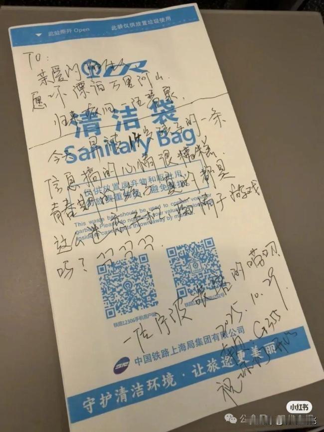 一位妈妈在高铁清洁袋上写下求救信:“今天一早被14岁孩子的一条信息搞得心情很糟糕