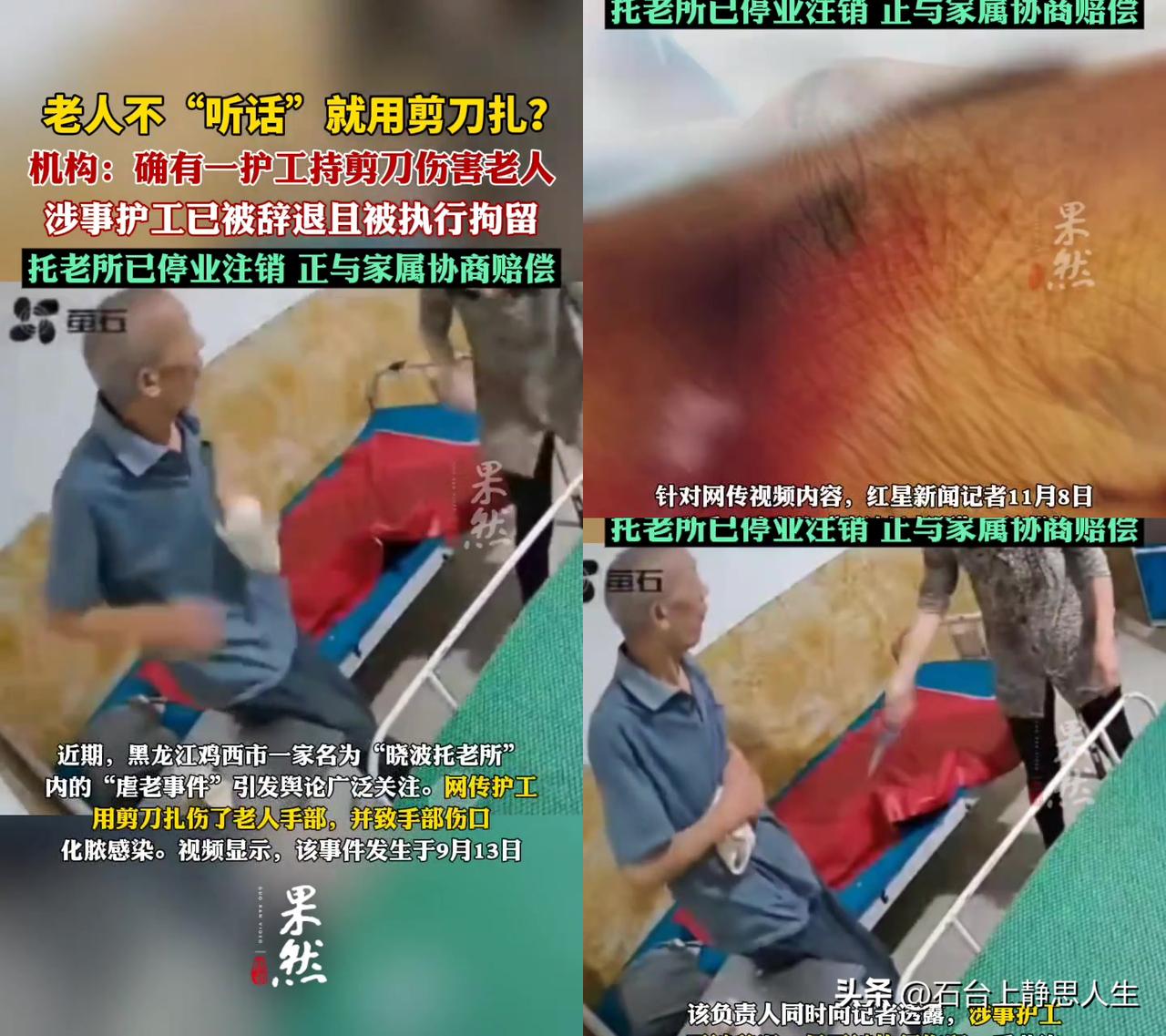 你有没有想过?把父母送托老所,最怕的或许不是“吃得好不好”,而是“会不会被欺负”? 黑龙江鸡西晓波托老所的事,把所有子女的恐惧变成了现实:9月13日,护工用剪刀扎老人的手,扎得化脓,视频里的伤口让人浑身发抖。 现在涉事护工被拘留,托老所直接停业注销,正和家属谈赔偿。 有人说“这不是辞退的事,是伤害罪!” 也有人说“托老所早该严查,肯定还有没曝光的” 我妈昨天看了视频直哭:“万一我老了动不了,遇到这种人可怎么办?” 人老了最怕什么?不是病,是连反抗的力气都没有,任人欺负! 护工的剪刀扎的是老人的手,更是我们对老有所依的信任,必须判刑,不然谁还敢把父母送托老所? 大家怎么看?