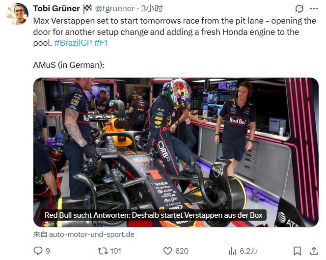 据AMus报道,维斯塔潘预计将在圣保罗大奖赛从维修区起步,这样一来能够再一次调整设定, 同时增加一台全新的本田引擎。