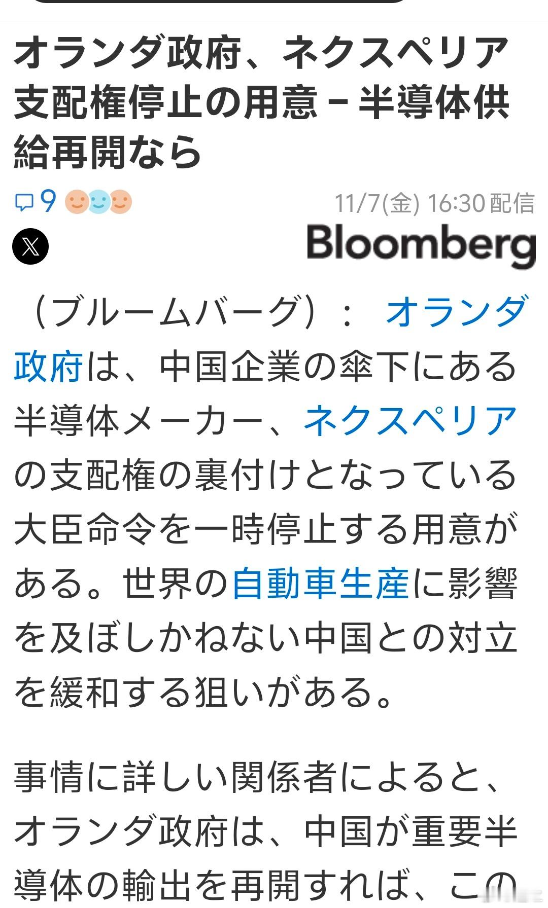 彭博社的意思是,荷兰将会撤销对安世半导体的措施,完全后撤投降。不过下周完全达成目