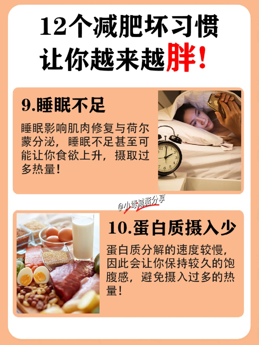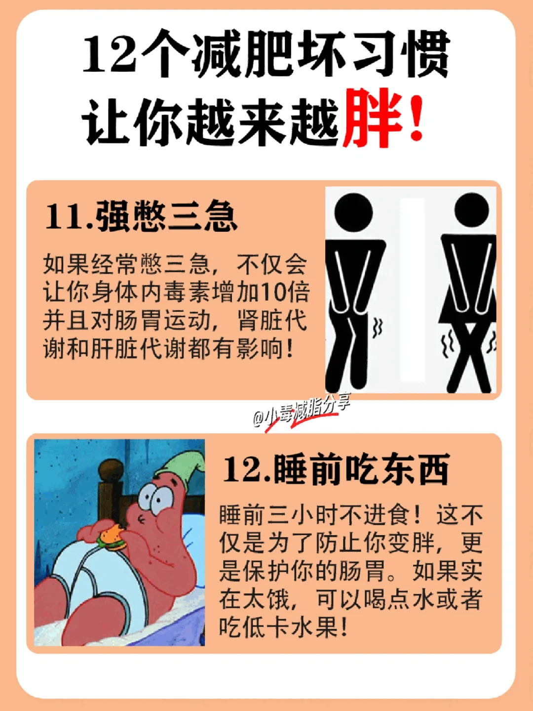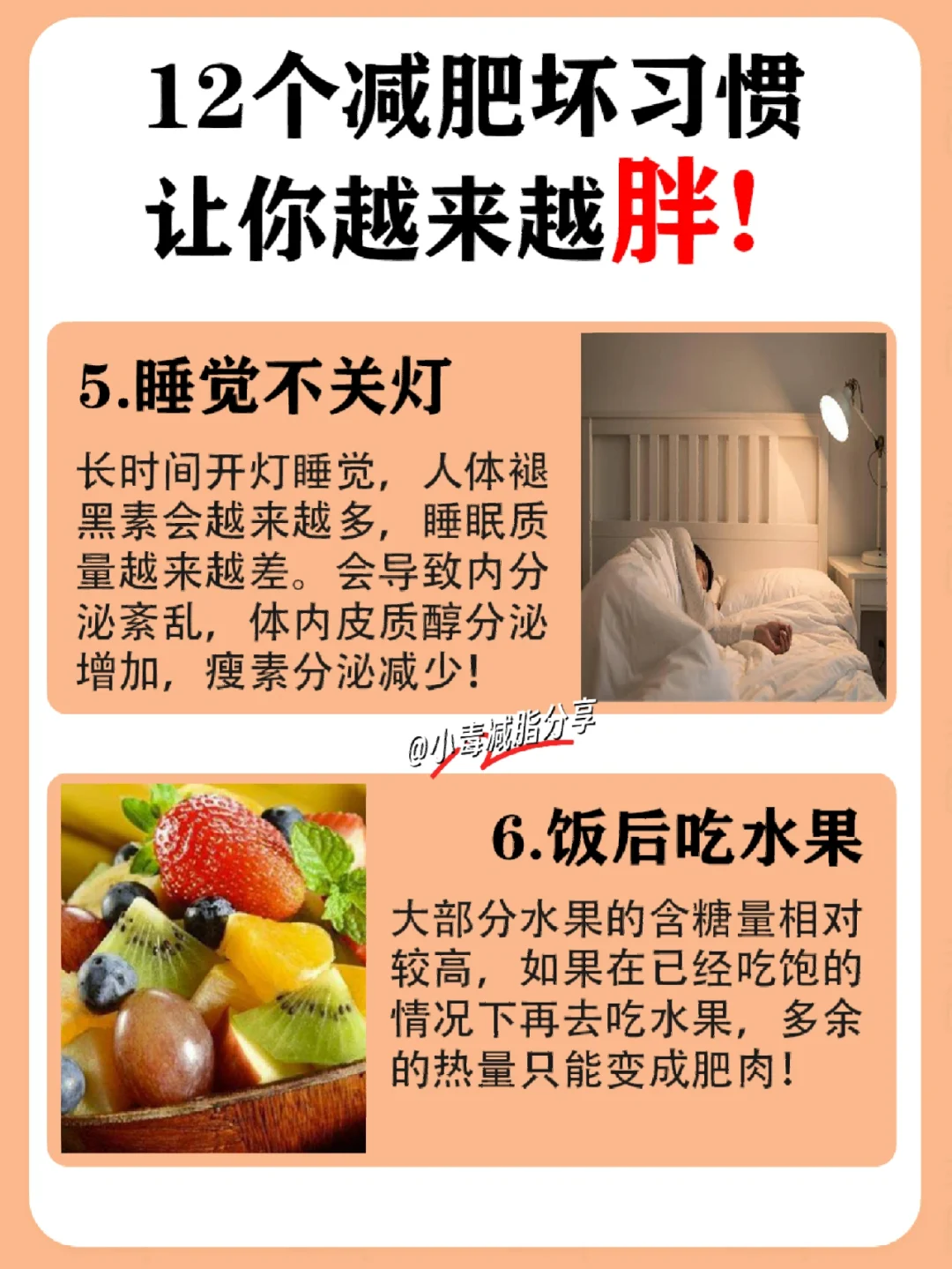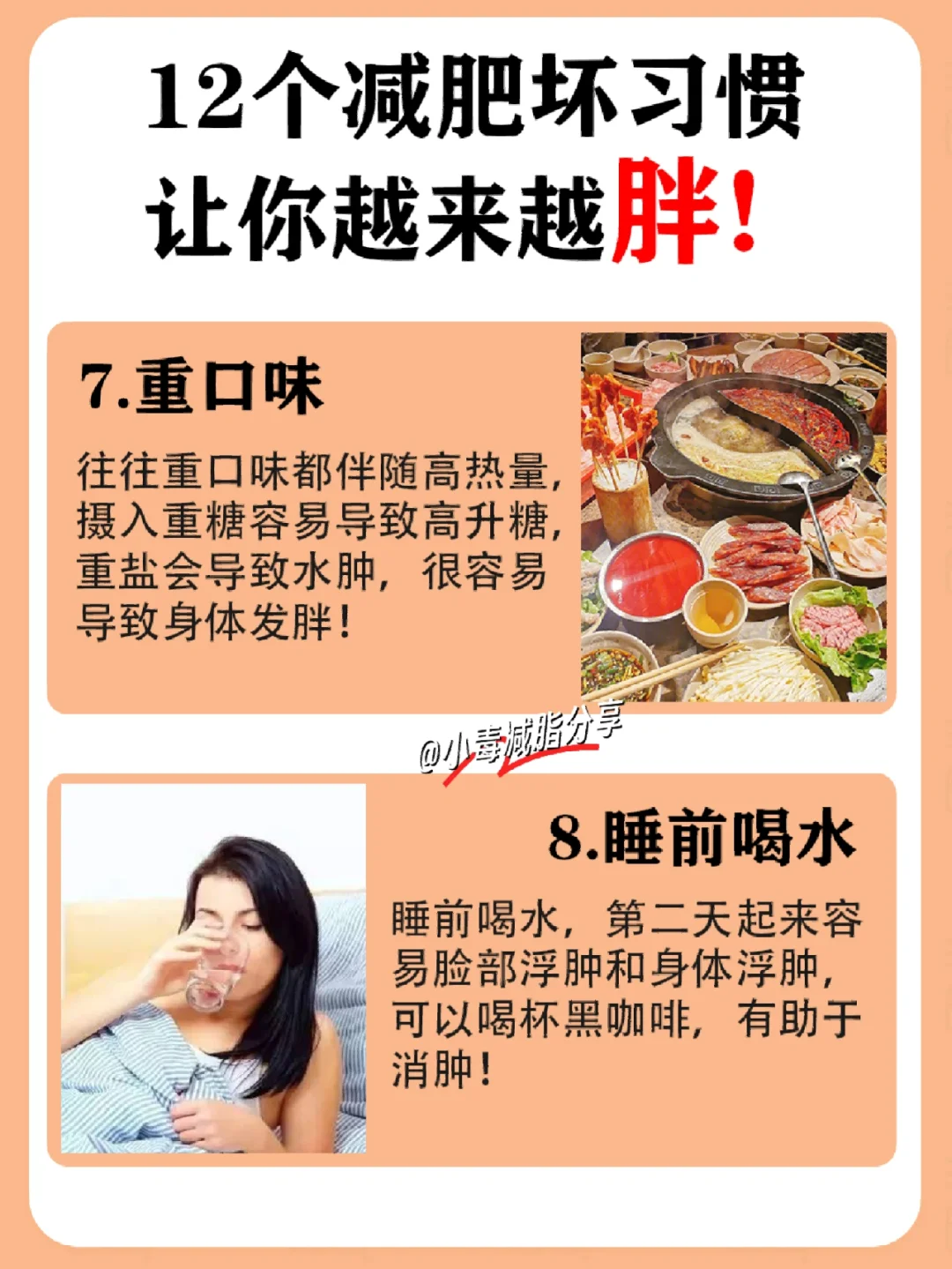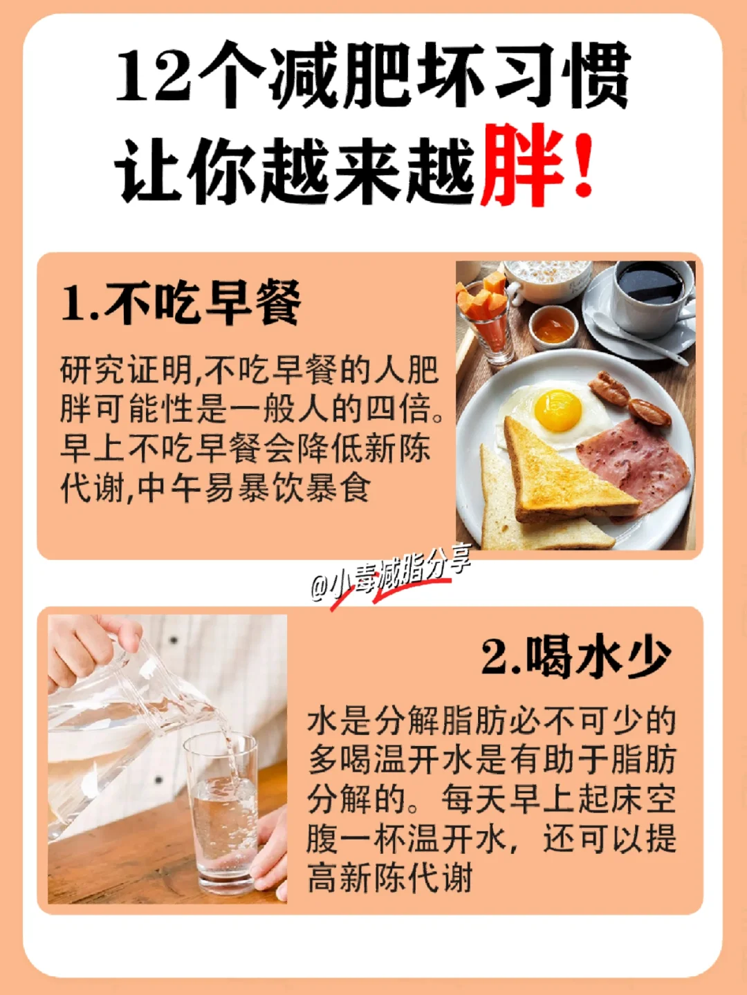 小毒能成功减重3⃣0⃣斤,是因为这几个坏习惯从来不碰‼️ 这12个减肥坏习惯,是很多宝宝在减肥过程中会犯的错误,想要减肥就一定要避开这些坏习惯,否则会让你越来越胖‼️ ✨1⃣不吃早餐 研究证明,不吃早餐的人肥胖可能性是普通人的四倍。不吃早餐会降低新陈代谢 . ✨2⃣喝水少 水是分解脂肪必不可少的物质,多喝水是有助于燃烧脂肪的 . ✨3⃣狼吞虎咽 我们吃饭一般需要20分钟才能将吃饱的信号传递给大脑,所以吃饭太快容易摄入过多的热量 . ✨4⃣久坐不动 久坐不动是大肚腩的罪魁祸首,会造成代谢水平低,导致身体血液循环不畅 . ✨5⃣睡觉不关灯 长时间开灯睡觉,人体褪黑素会越来越多,睡眠质量越来越差,会导致内分泌紊乱,体内皮质醇分泌增加,瘦素分泌减少 . ✨6⃣饭后吃水果 大部分水果的含糖量相对较高,饭后再吃水果容易造成热量过剩 . ✨7⃣重口味 高糖高盐高油都是不利于减肥的 . ✨8⃣睡前喝水 睡前喝水容易水肿 . ✨9⃣睡眠不足 睡眠影响肌肉修复与荷尔蒙分泌,睡眠不足不利于减肥 . ✨🔟蛋白质摄入少 蛋白质分解的速度慢,会让你保持较长时间的饱腹感,从而减少热量的摄入 . ✨1⃣1⃣强憋三急 如果经常憋三急,不仅会让你身体内的毒素增加十倍,并且对肠胃运动,肾脏代谢和肝脏代谢都有影响 . ✨1⃣2⃣睡前吃东西 睡前吃东西会消化不了,自然而然的就转化为了肥肉辣 姐妹们,想要变瘦,这几个坏习惯千万不要碰哦