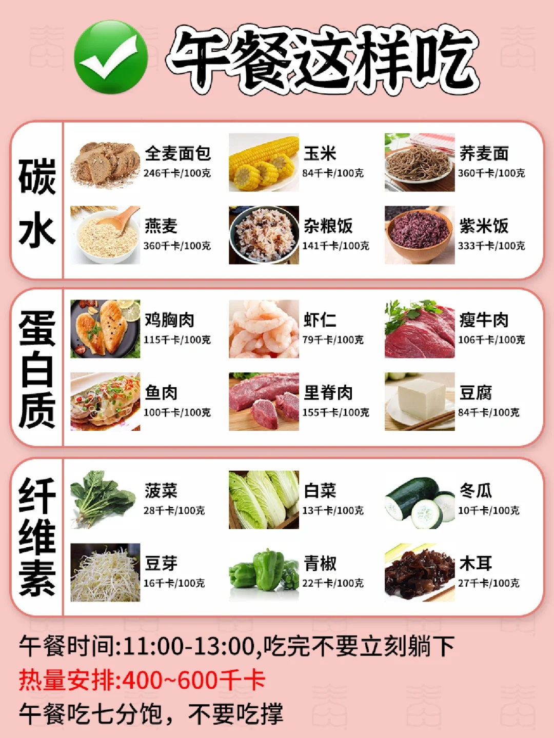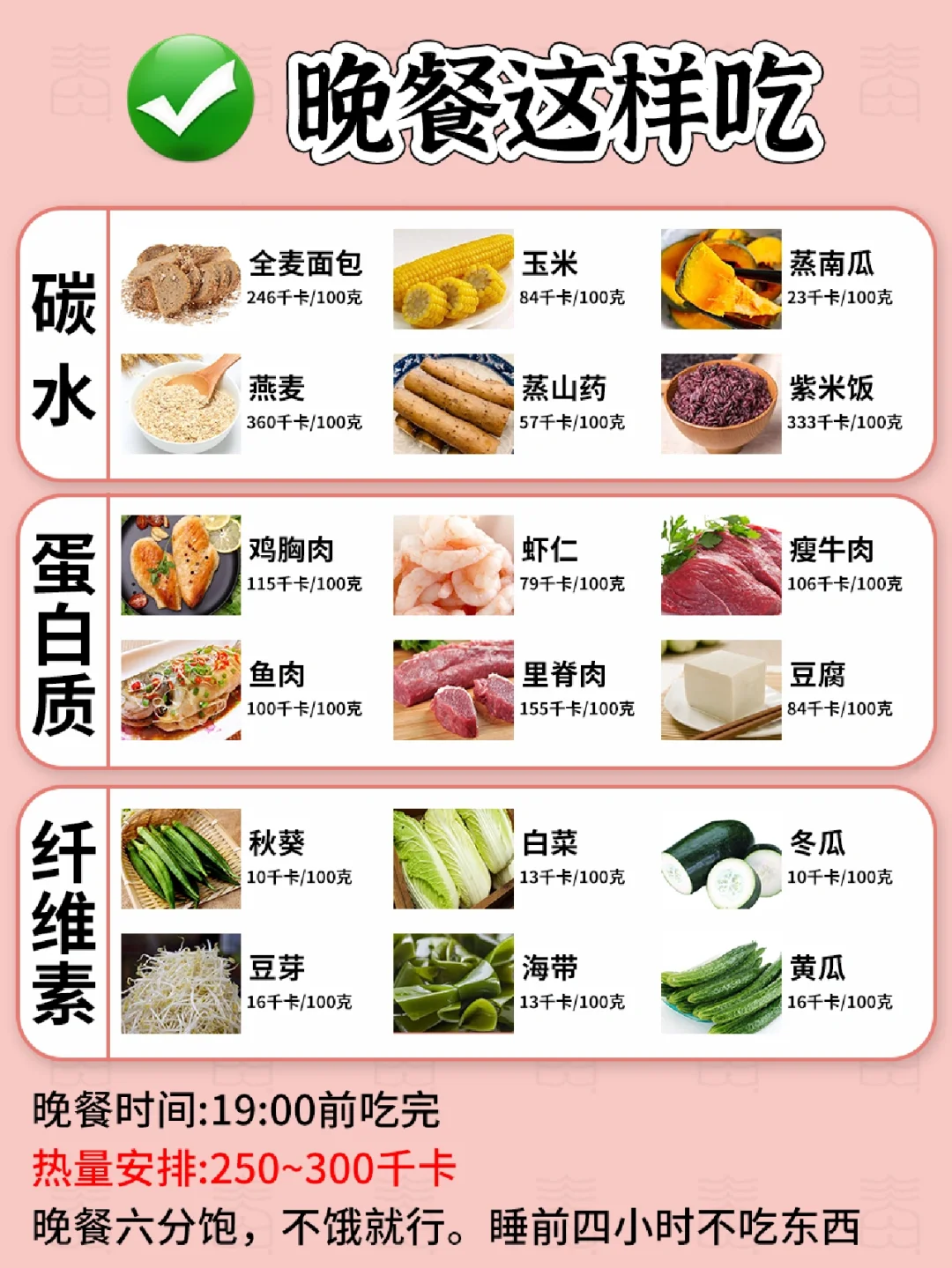 全麦面包、玉米、蒸南瓜、燕麦、鸡胸肉、鱼肉、豆腐、冬瓜、秋葵、海带等