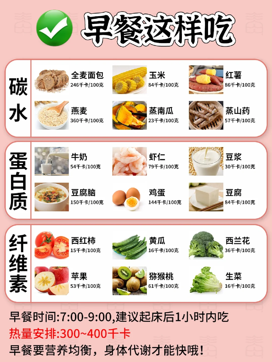 全麦面包、玉米、红薯、牛奶、虾仁、豆浆、西红柿🍅、黄瓜🥒等
