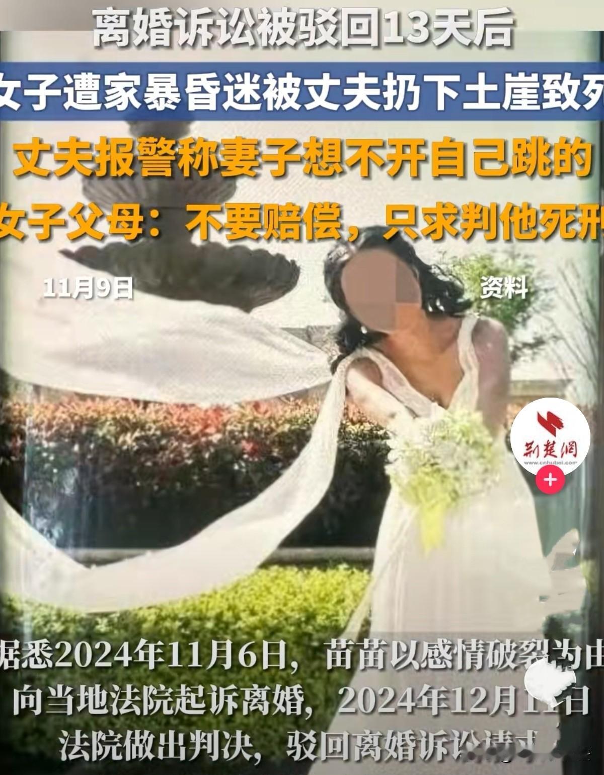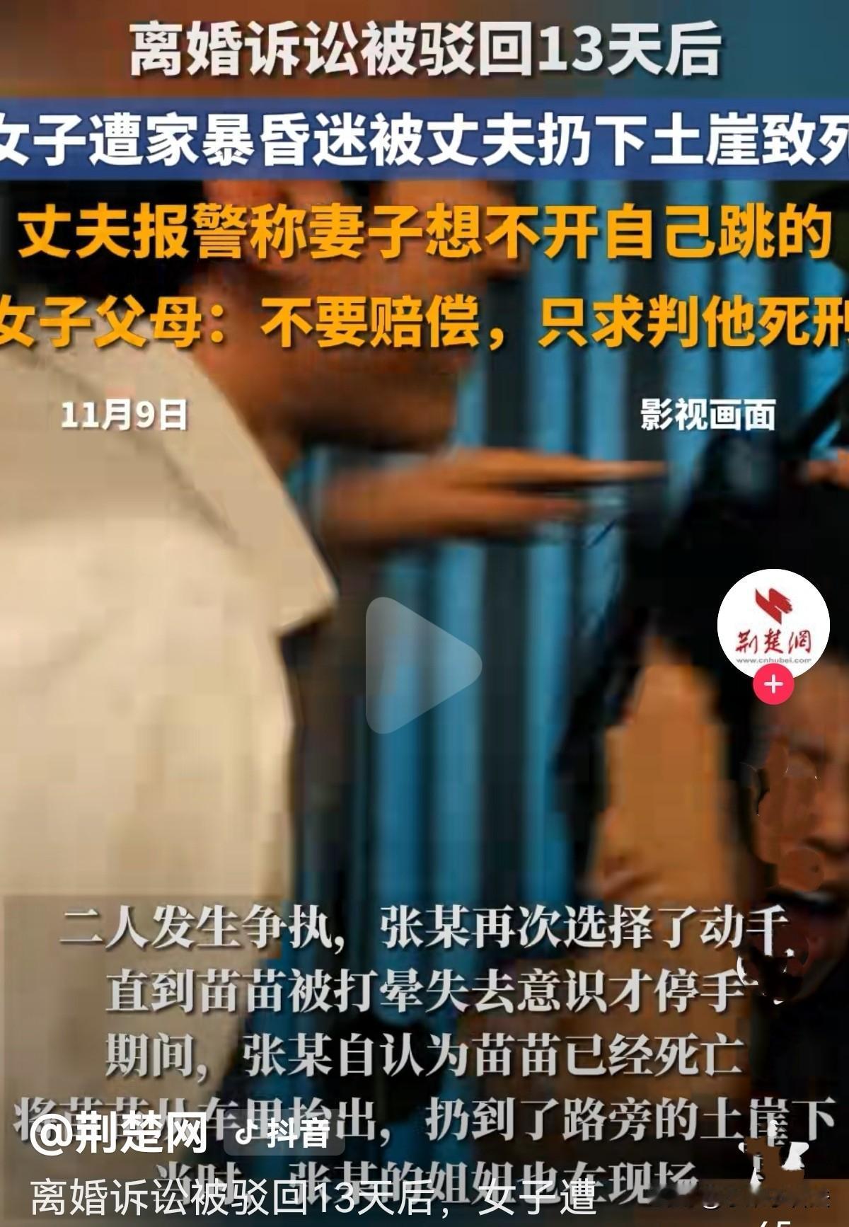 陕西咸阳,女子结婚9年,多次遭丈夫家暴,她忍无可忍提起离婚诉讼,然而离婚诉求被驳回13天后,遭丈夫家暴至昏迷,被他抛下10几米土崖下身亡!更可恨的是大姑姐还在现场,公公及大姑姐还参与做假证,丈夫被以故意杀人罪提起公诉。其父跪求女子父母谅解,说不看大人要看2个孩子,爸妈都没了,自己70多岁了没生活来源,怎么养2孙子啊!女子父母拒绝任何民事赔偿,只求死刑判决! 1993年出生的苗苗,只有小学文化,在她21岁时,媒人给她介绍相隔4公里邻村的张某。 对于张某,她有印象,是哥哥初中同学,比她大3岁,曾同哥哥来过家里。 两人对彼此都有好感,很快相恋,并于2015年4月27日登记结婚。 婚后,他们连着生了2个儿子,因此生活的压力接踵而来,张某逐渐暴露暴躁本性,夫妻俩争吵成了家常便饭,苗苗对婚姻的憧憬很快被现实击碎。 苗苗多次遭遇丈夫家暴,她选择将更多委屈藏在心底,也极少向家人倾诉,只报喜不报忧! 她曾在网上发一些“一步走错,步步后悔”“过不成便各走各”的字句,屡屡透露着婚姻的裂痕。 有看到她发的文字的亲友以为他们夫妻间闹摩擦,纷纷劝和,不知真实情况的父亲还经常叮嘱女儿,过日子莫任性! 张某在外打工几年间,苗苗没再被家暴,两人关系还算平和。 2024年,在外打工的张某返乡后,经济压力、家庭琐事与无端猜忌让夫妻矛盾彻底爆发,张某的暴力行为愈发频繁。 7月,张某在一次家暴后发来长篇道歉信息,承诺绝不再动一根手指头,可这份忏悔转瞬即逝。 8月20日,苗苗浑身是伤的照片传到亲属手中,伤痕遍布手脚与关节,当晚她曾报警求助,随后前往医院就诊,诊断结果显示其患有焦虑性抑郁恐惧。 身心俱疲的苗苗终于下定决心离婚。2024年11月6日,她以感情破裂为由向法院提起离婚诉讼,却在12月11日收到了驳回的判决。 不愿再回张家的苗苗,在西安周边租了一间小屋暂住,却没想到张某通过快递信息找到了她的住址。 12月22日,张某强行将苗苗拉回家中,期间险些将她掐死,幸得民警介入,苗苗才得以暂时脱身。 亲戚反复叮嘱她遇事立刻报警,可谁也没能阻止3天后的惨剧。 12月24日清晨,张某驾驶面包车再次前往苗苗的租住地,试图挽回婚姻的谈判最终演变成暴力殴打。 在出租屋外,张某对苗苗持续施暴,直至她失去意识。现场满地干涸血迹、损毁的木凳与石墩上的血痕,无声言喻当时的惨烈。 令人发指的是,张某并未第一时间送医,反而驾车带着昏迷的苗苗在路上徘徊,期间虽经亲属劝说前往医院,却在医生建议转院后选择折返。 途中,他以为苗苗已死亡,将苗苗扔到了通往自家路上的一处几10米高的土崖下,张某姐姐当时就在现场,未阻拦。 而后,张某前往苗苗父亲家中,假意催促对方找回苗苗协商离婚。 苗父说快过年,等过完年后再说,他哪里知道,女儿已被张某抛下了悬崖! 随后,张父劝其报警,说苗苗是自行跳崖,张父及姐姐也提供虚假证言试图包庇。 警方赶到现场,将崖下的苗苗捞出。司法鉴定显示,苗苗系高坠导致头部、胸腹腔多脏器损伤死亡。 警方的细致调查,当晚张某便如实供述了全部犯罪事实。 张某父亲与姐姐因谎报案情、影响案件办理,被处以行政拘留10日并罚款500元的处罚。 苗苗的父母痛不欲生,悔恨当初未能及时支持女儿离婚,导致她失去了年轻的生命! 面对张某家人跪地请求谅解,苗苗父母断然拒绝:他当初没放过我娃,凭啥放过他? 对只有8岁、7岁的的两个孙子,张父表示,他们没妈了,爸爸再判死刑,自己70多岁了,无能力及经济来源,养活他们长大! 苗苗父母虽心疼两个外孙,却无法原谅剥夺女儿生命的凶手,他们拒绝任何民事赔偿,只求死刑判决。 张某以涉嫌故意杀人罪已被提起公诉。 《刑法》第232条规定,故意杀人的,处死刑、无期徒刑或者10年以上有期徒刑;情节较轻的,处3年以上10年以下有期徒刑。 张某在误以为苗苗已死的情况下,将其扔到路边土崖下,经司法鉴定,苗苗系高坠致头部、胸腹腔多脏器损伤死亡。 客观上张某实施了将苗苗扔下土崖导致其死亡的行为;主观上张某对可能造成苗苗死亡的结果存在放任的故意,即间接故意。 综合主客观要件,张某的行为符合故意杀人罪的构成要件,应当以故意杀人罪追究其刑事责任。 《刑法》第5条规定,刑罚的轻重,应当与犯罪分子所犯罪行和承担的刑事责任相适应。 张某长期对苗苗实施家暴,在离婚诉讼被驳回后不久再次实施暴力行为,并在苗苗昏迷情况下将其扔下土崖致其死亡,犯罪手段残忍,情节恶劣。 张某的行为严重侵犯了他人的生命权,对社会秩序和家庭伦理造成了极大的破坏。 并且他向警方谎报案情,没有及时认罪悔罪的表现。 受害者父母不出示谅解书,不接受民事赔偿,只求法院严判的意愿。 法院会对张某作出公正的量刑判决。 您对苗苗父母的做法怎么看?