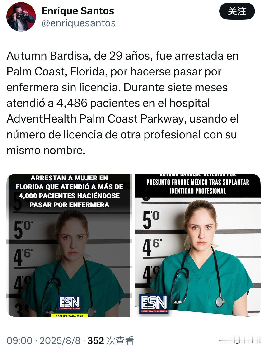 这名女子是来自佛罗里达的奥特姆·巴迪萨 (Autumn Bardisa),29 岁,被指控冒充注册护士,在一家当地医院工作了七个月,在此期间治疗了4,486 名患者。 2025 年 8 月 6 日,巴迪萨被捕。执法记录仪的画面显示了她被捕时的情景(见图)。 她是在医院试图提拔她时被发现的,医院工作人员发现她冒充的是另一名住在州外的真护士。她目前面临多项指控,包括无证执业和欺诈性使用他人信息。