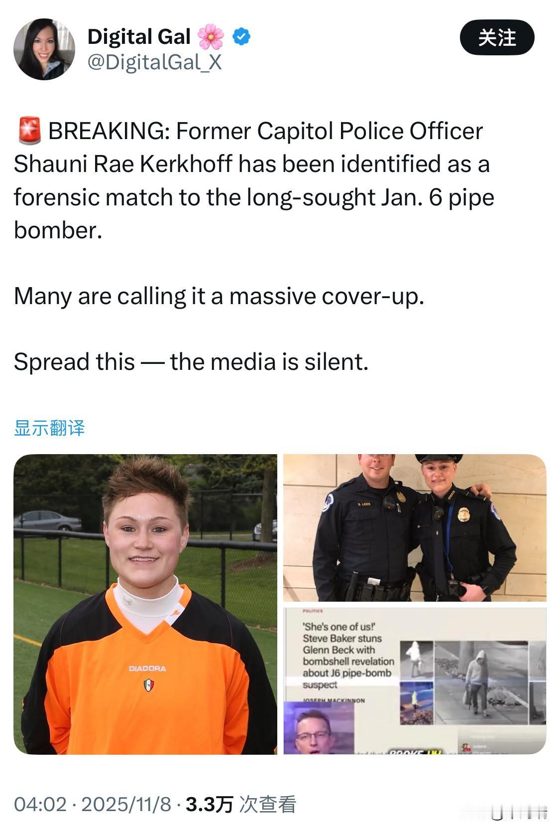 突发新闻:前国会警察 Shauni Rae Kerkhoff 的法医鉴定结果与长期以来一直在追捕的 1 月 6 日管道炸弹袭击者相符。这进一步证实了J6是民主党,DC警察,和情报机关联手导演的一场骗局,用来政治上陷害川普和MAGA! J6 管道炸弹袭击者调查结果:31岁的前美国国会警察 Shauni Rae Kerkhoff的步态分析结果与2021年1月5日在DNC)和RNC总部放置管道炸弹的蒙面嫌疑人吻合度高达 94-98%。 🔻 使用方法 ⚡️计算机步态分析软件:吻合度 94% ⚡️人类法医专家:吻合度 96-98% ⚡️匹配的身体特征:身高5英尺7英寸(约 1.70 米),2015年胫骨骨折(足球运动受伤)导致的明显跛行 ⚡️行为特征匹配可在未向公众发布的,未经编辑的高分辨率的FBI/国会大厦录像中观察到 🔻 背景 ⚡️2018年至2021年中期担任美国国会警察 ⚡️民事骚乱小组成员及非致命武器教官 ⚡️曾向J6抗议者发射弹药 ⚡️后加入中央情报局要员保护小组(曾为前局长John Ratcliffe工作) ⚡️前大学/半职业足球运动员,2018年波士顿马拉松完赛者 🔻 消息来源 ⚡️国会消息人士:“执法部门参与其中” ⚡️前FBI特工Kyle Seraphin:爆炸案发生数日后,FBI距离嫌疑人“仅一门之隔”,却故意中止了调查 ⚡️前国会警察局长Steven Sund否认曾被授权参与此事