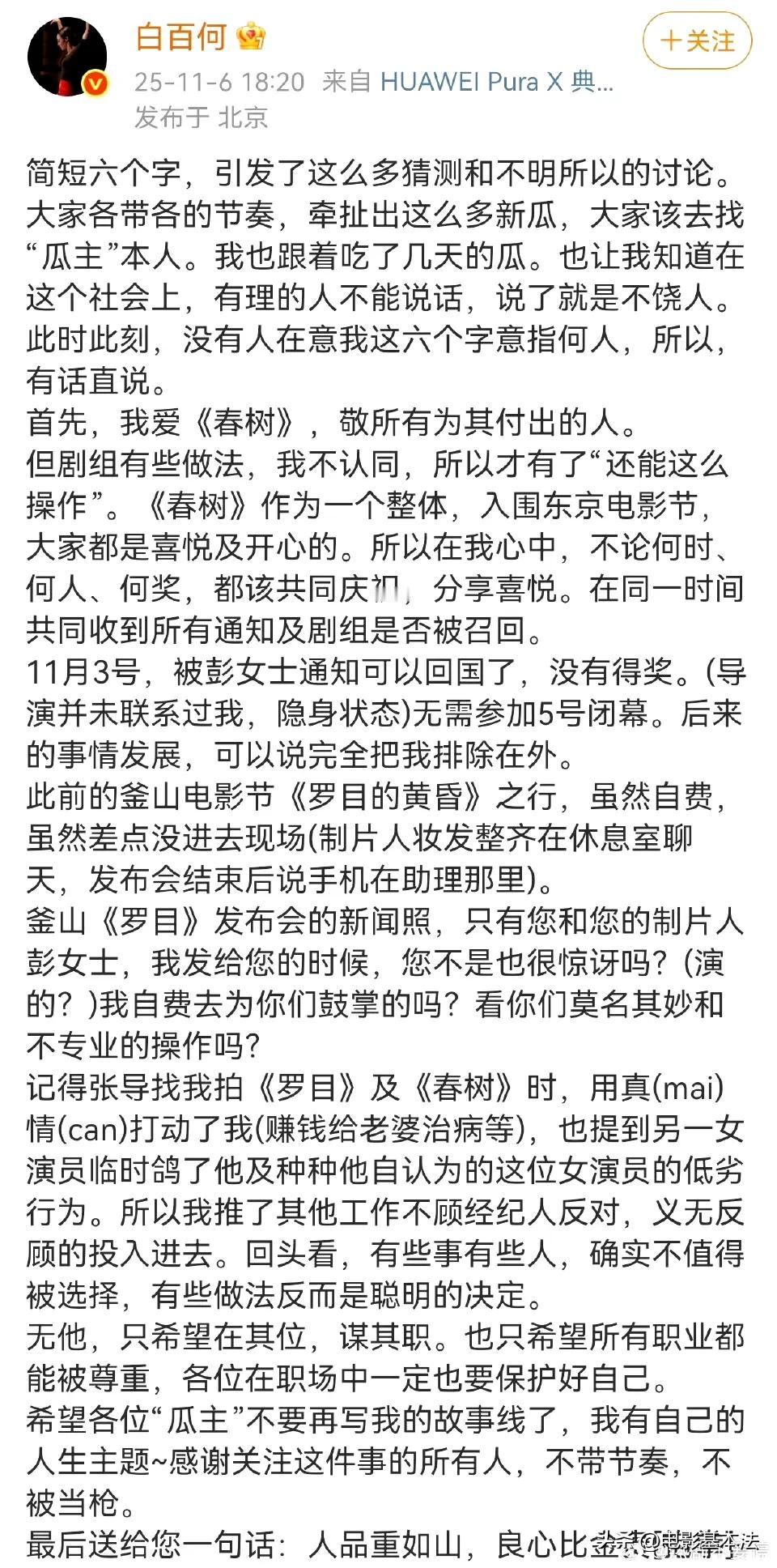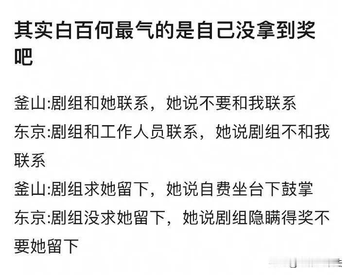 白百何这么一闹,最大的受害者出现了,就是王传君,本来王传君拿了影帝可以全网好好宣传一波,现在被白百何来了这么一下,让王传君都不敢庆祝了。 另外,有网友总结了白百何东京电影节的全部疑点,结果全部的方向都指向是白百何的问题,而且这件事还爆出了很多白百何以前的负面新闻,她这次闹的可以说是得不偿失,典型的“损人不利己”。 这次没拿到影后,以后就拿不到了,多年后白百何回忆今天的风波,一定会很后悔吧。