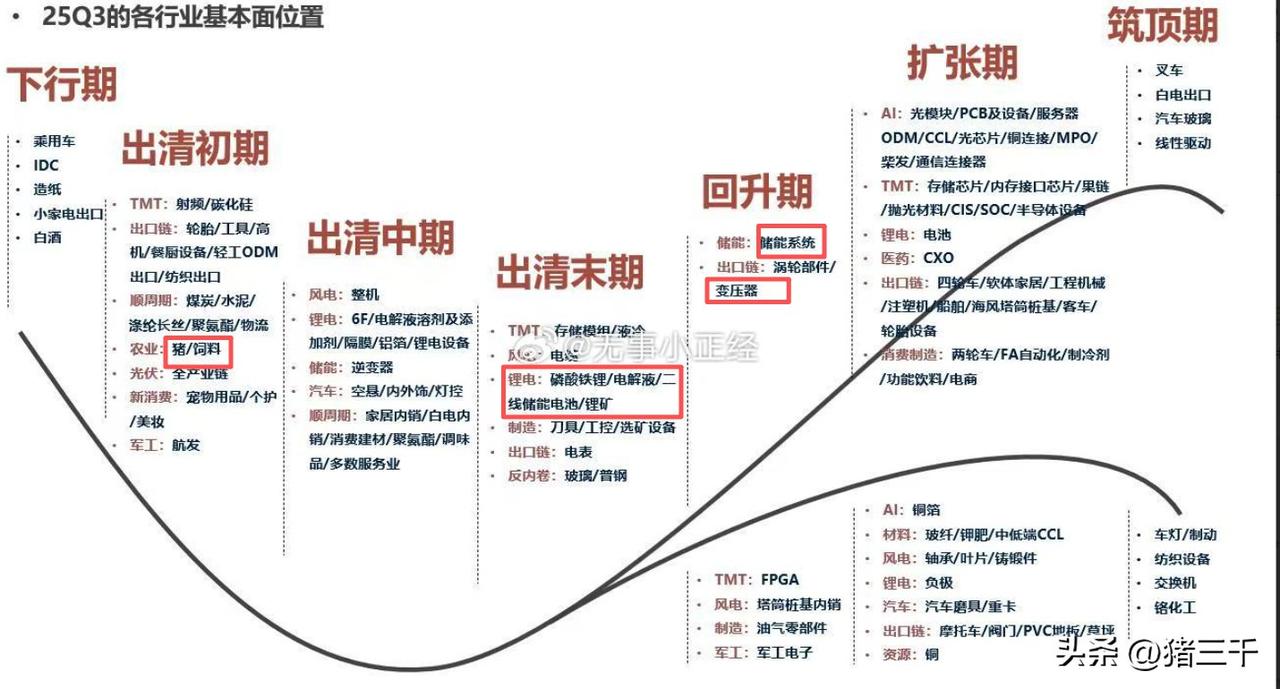 A股牛市下半场走基本面牛市, 那么各行业目前基本面所处的位置如何? 看到一份有意思的基本面统计数据图表: 不得不看清猪周期3.5年规律已经完全打破, 产能向头部企业集中供需平稳, 下半年的基本面同比肯定没法看; 产能出清新增长周期无疑想象空间最大, 而储能无疑是唯一满足条件的; 至于持续涨价和扩张的, 光模块、存储过了3-4倍涨幅最肥美阶段, 往后操作难度越拉越大…