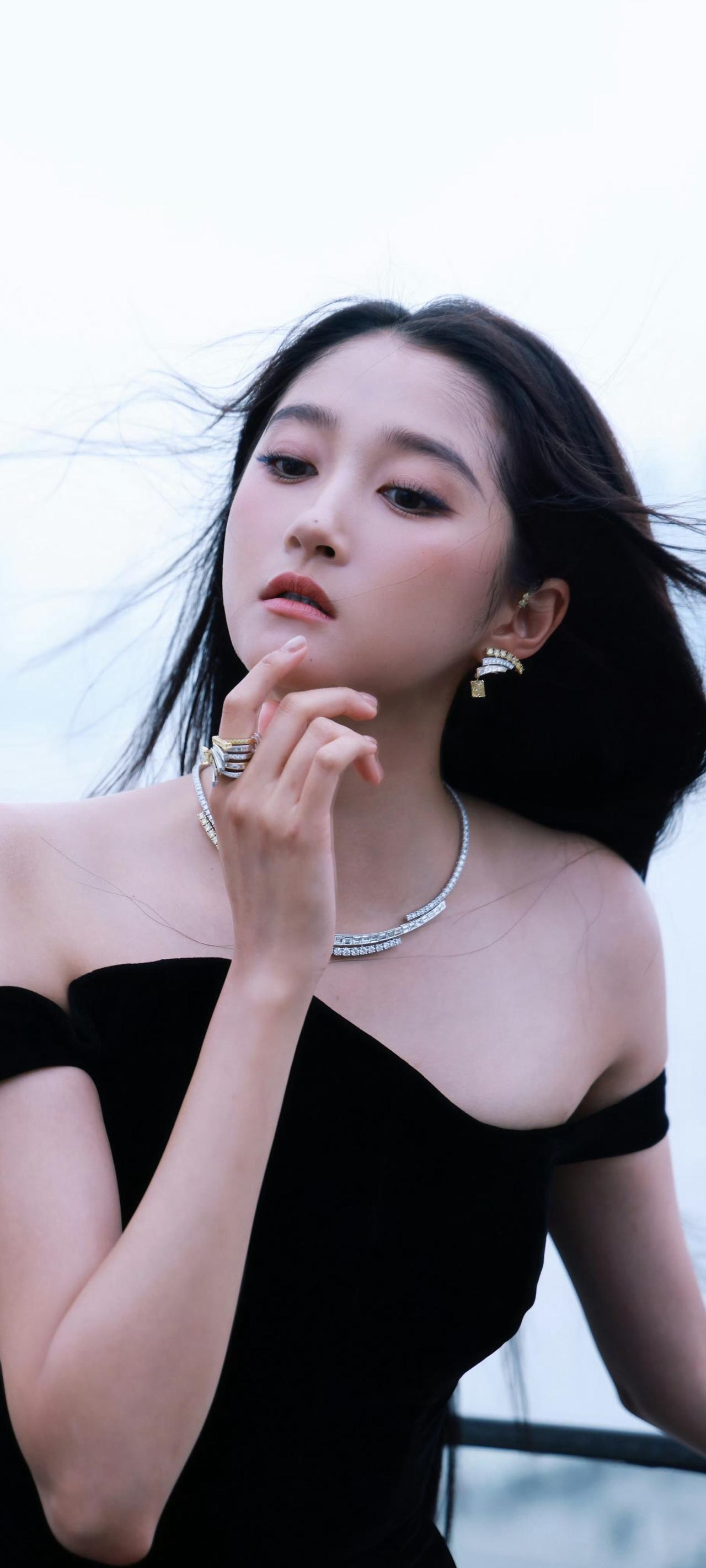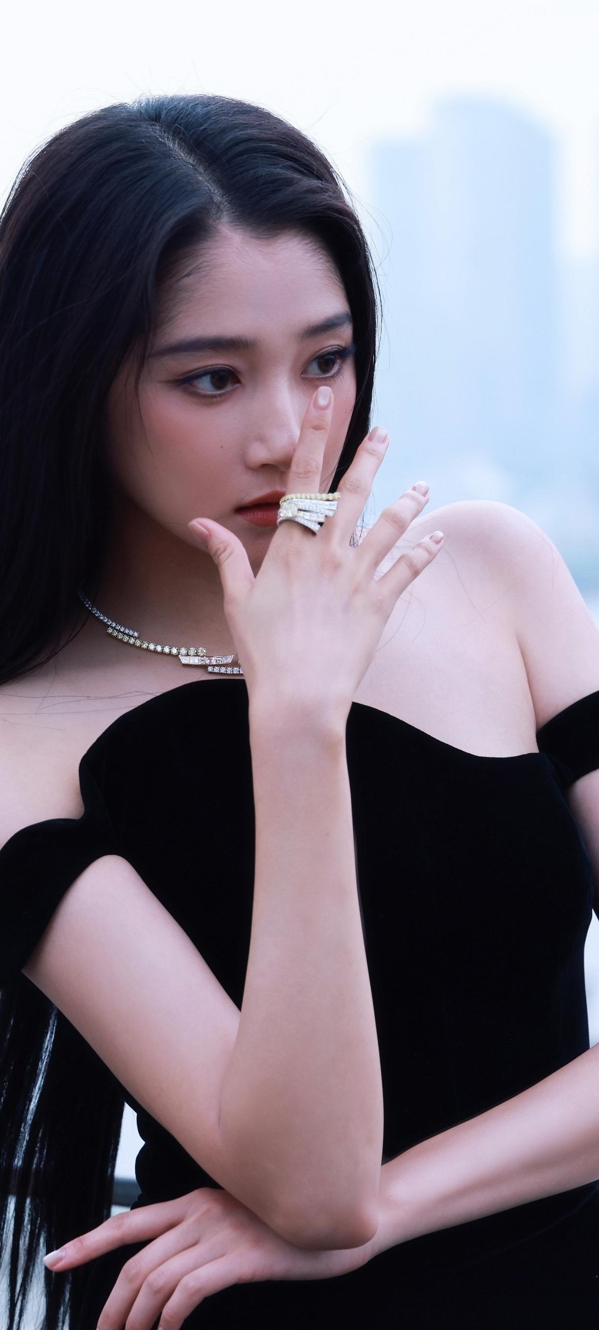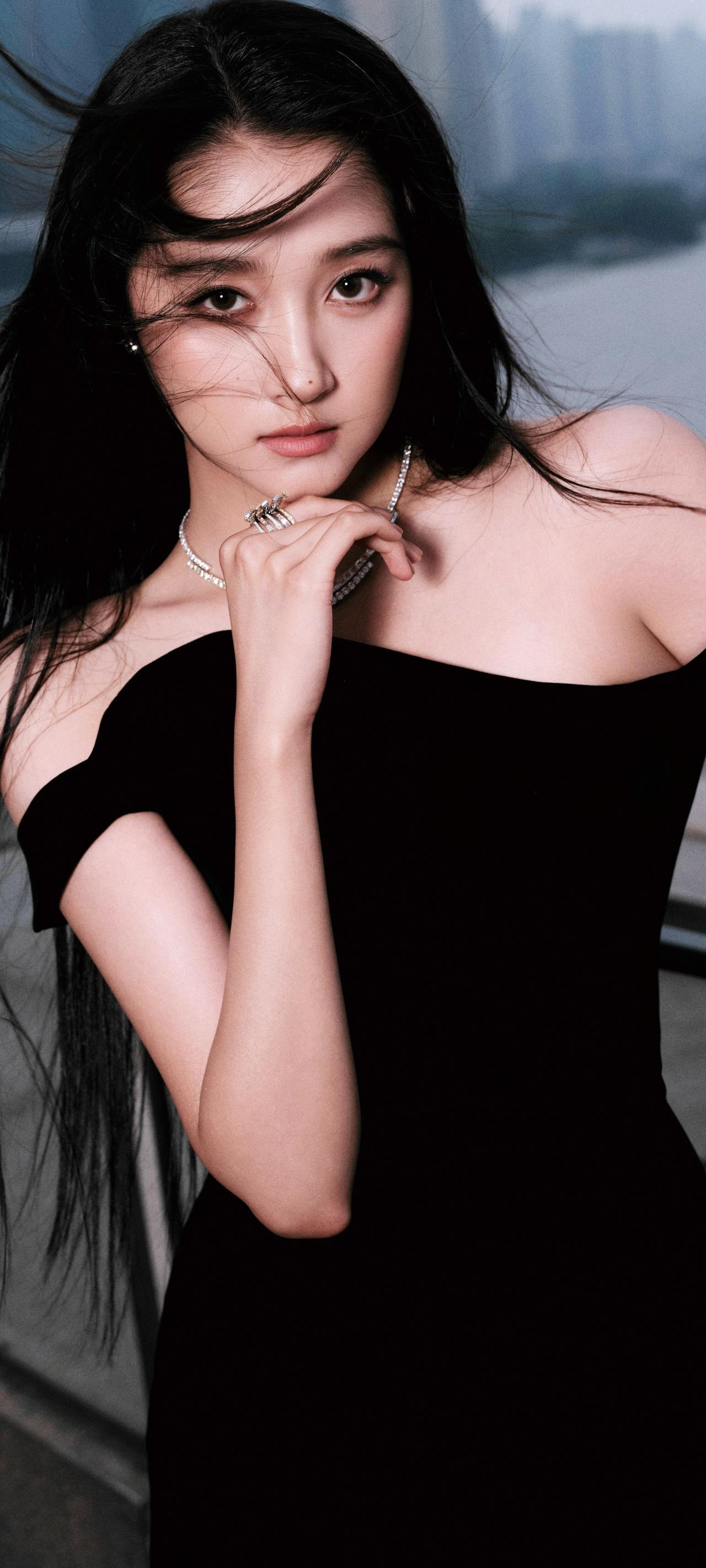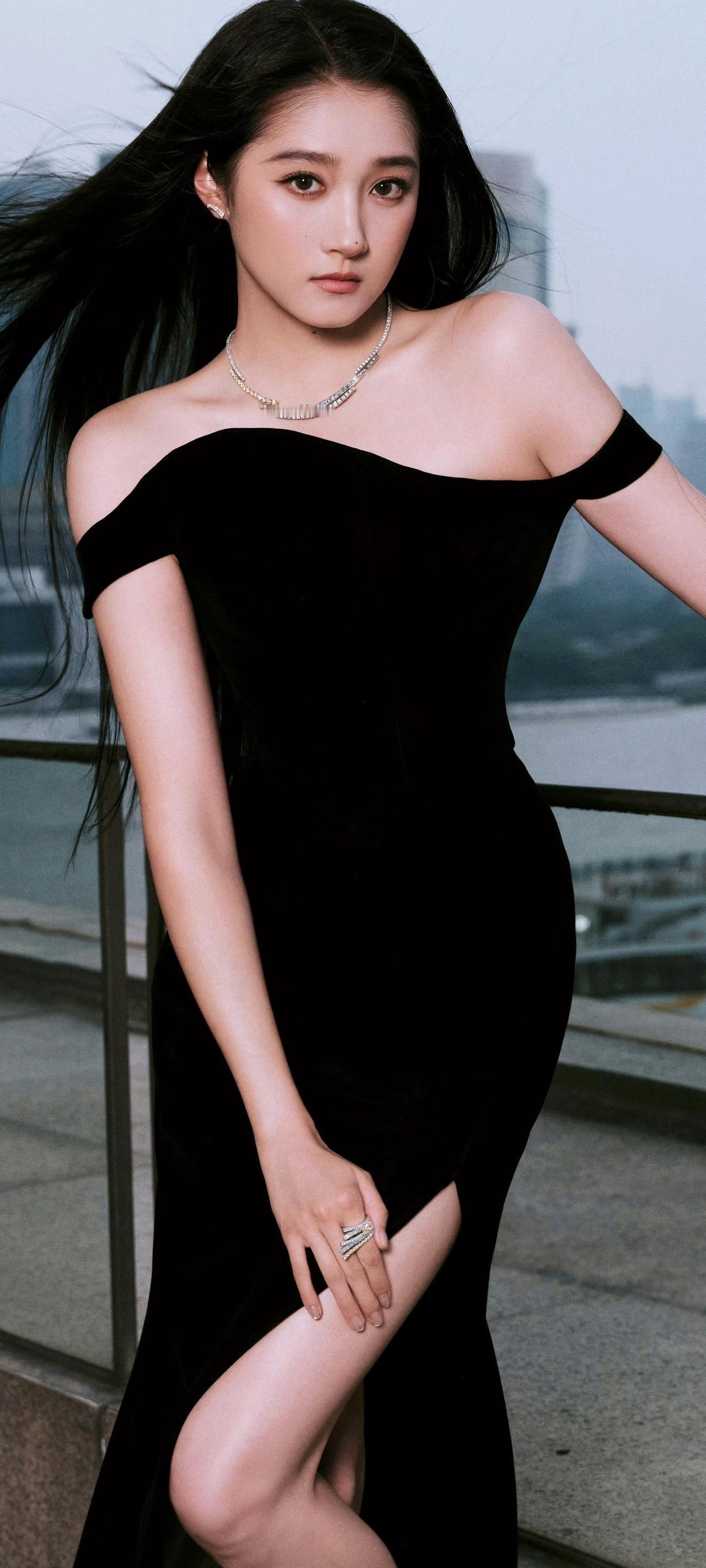 关晓彤,都市女郎的优雅姿态,黑色晚礼服与城市天际线完美融合,尽显时尚与魅力。 气质女明星