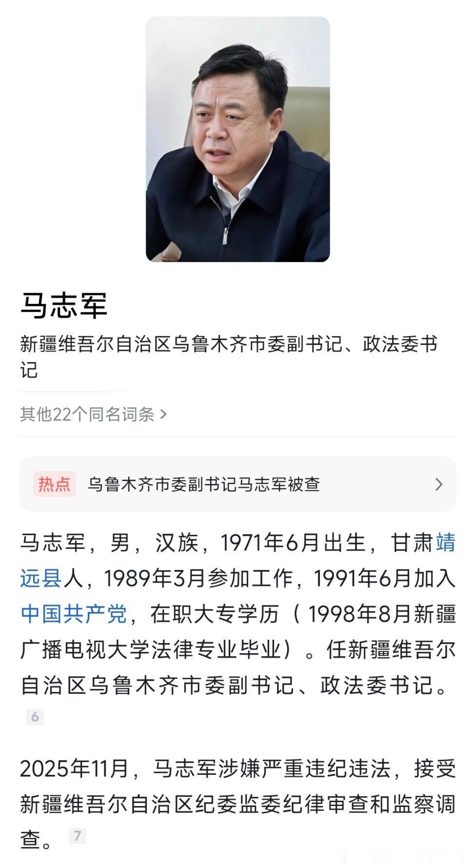 乌鲁木齐市委副书记、政法委书记马志军接受纪律审查和监察调查。热点现场