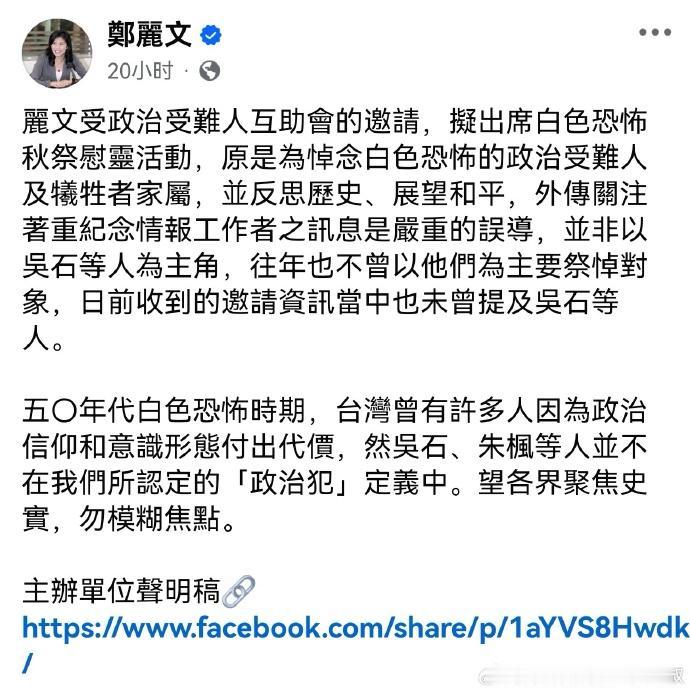 郑丽文露出了本色,让那些视她为稻草,拼命去抓的人情何以堪? 在台湾牺牲的隐蔽战线的烈士不稀罕国民党的祭拜,也绝不允许被他们政治利用。 待到大军过海,台湾从半殖民地的状态下被解放出来之后,我们要在台湾的所谓“总统府”前的广场上,为吴石将军、朱枫烈士等一干英烈,建一组高入云霄的铜像!