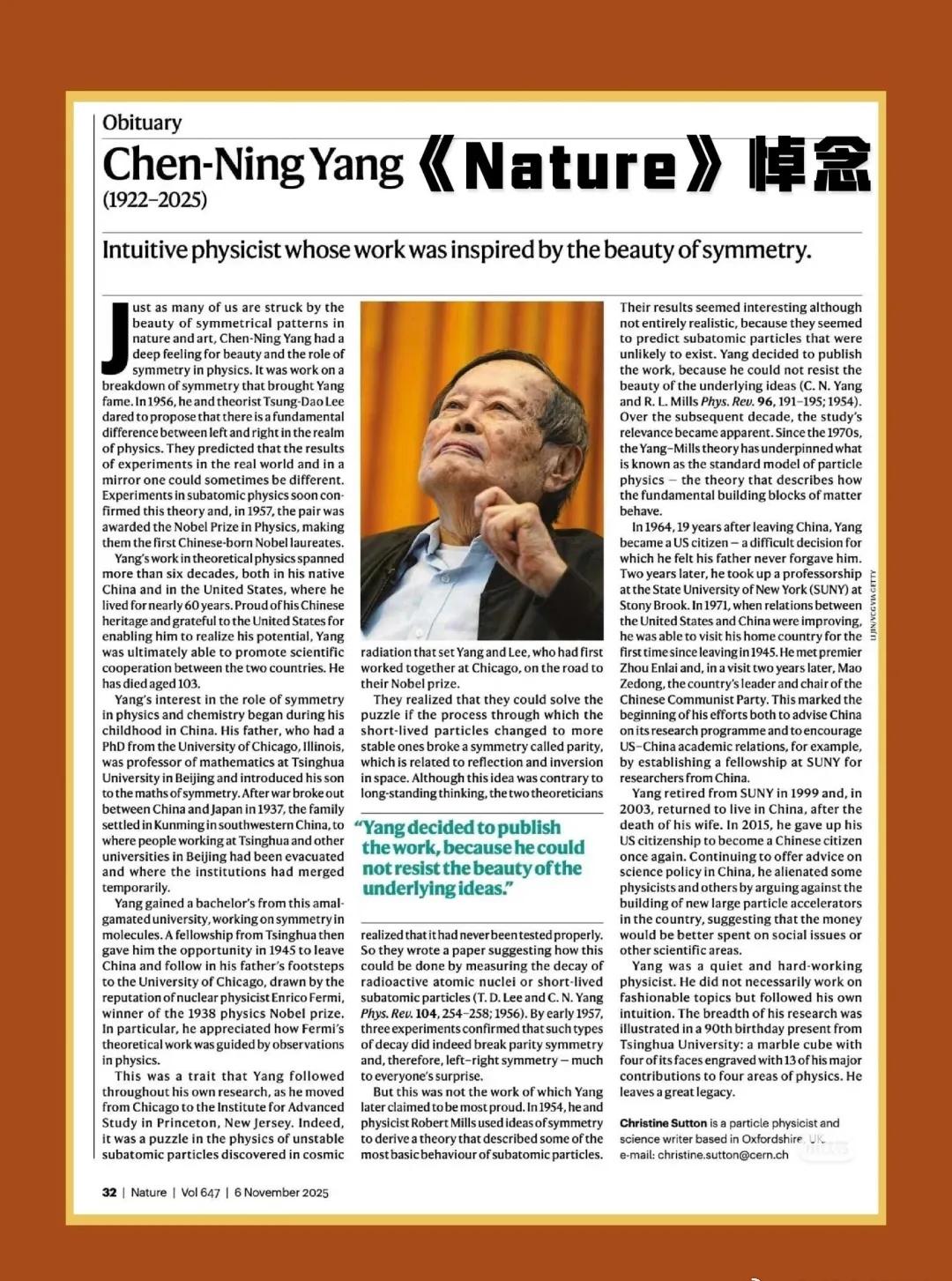 《Nature 》发文悼念杨振宁 Nature 发文悼念杨振宁:Chen-Ning Yang obituary: intuitive physicist whose work was inspired by the beauty of symmetry。全文翻译如下: 图片 图片 就像我们许多人会被自然界与艺术中对称图案的美感所震撼一样,杨振宁对物理学中的美感与对称性的作用有着深刻体悟。正是一项关于对称性破缺的研究为他赢得了声誉。1956 年,他与理论物理学家李政道大胆提出,在物理学领域中,左与右存在根本性差异。他们预言,现实世界中的实验结果与镜像世界中的结果有时会有所不同。亚原子物理学实验很快证实了这一理论,1957 年,二人共同荣获诺贝尔物理学奖,成为首位华裔诺贝尔 laureates。 杨振宁的理论物理学研究跨越六十余年,足迹遍及故土中国与居住近 60 年的美国。他为自己的中国血统感到自豪,也感激美国让他得以发挥潜力,最终促成了两国间的科学合作。他享年 103 岁。 杨振宁对物理学与化学中对称性作用的兴趣,始于他在中国的童年时期。他的父亲拥有美国伊利诺伊州芝加哥大学的博士学位,时任北京清华大学数学系教授,正是父亲将对称性相关的数学知识介绍给了他。1937 年中日战争爆发后,杨家迁居中国西南部的昆明 —— 当时北京清华大学等高校的人员已疏散至此,并临时合并组建了联合大学。 杨振宁在这所联合大学获得学士学位,研究方向为分子对称性。随后,凭借清华大学的奖学金,他于 1945 年离开中国,追随父亲的脚步前往芝加哥大学,而吸引他的正是 1938 年诺贝尔物理学奖得主、核物理学家恩里科・费米的学术声誉。 他尤其推崇费米的理论研究始终以物理观测为导向的治学方式。这一特质贯穿了杨振宁的整个科研生涯 —— 从芝加哥大学到新泽西州普林斯顿高等研究院,他始终坚守这一原则。事实上,正是宇宙辐射中发现的不稳定亚原子粒子物理学谜题,让曾在芝加哥大学共事的杨振宁与李政道踏上了通往诺贝尔奖的道路。 他们意识到,若这些短寿命粒子衰变为更稳定粒子的过程违背了一种名为 “宇称” 的对称性(与空间反射和反转相关),这一谜题便可迎刃而解。尽管这一观点与长期以来的主流认知相悖,但两位理论物理学家发现,该对称性从未经过严格验证。于是,他们发表论文提出了验证方法:通过测量放射性原子核或短寿命亚原子粒子的衰变来证实(《物理评论》,T. D. 李、C. N. 杨振宁,104 卷,254-258 页,1956 年)。 1957 年初,三项实验均证实,这类衰变确实违背了宇称对称性,即左右对称性 —— 这一结果令所有人都倍感意外。 但杨振宁后来表示,这并非他最引以为傲的成果。1954 年,他与物理学家罗伯特・米尔斯运用对称性思想推导出一套理论,描述了亚原子粒子的部分基本行为。尽管他们的研究结果看似有趣却不完全符合现实 —— 因为该理论预言了一些不太可能存在的亚原子粒子,但杨振宁无法抗拒其核心思想的美感,最终决定发表这项研究(《物理评论》,C. N. 杨振宁、R. L. 米尔斯,96 卷,191-195 页,1954 年)。在随后的十年间,这项研究的重要性逐渐显现。自 20 世纪 70 年代起,杨 - 米尔斯理论成为粒子物理学 “标准模型” 的核心基础 —— 该模型描述了物质基本构成单元的行为规律。 1964 年,离开中国 19 年后,杨振宁加入美国国籍 —— 这一艰难的决定让他觉得父亲始终未能原谅自己。两年后,他出任纽约州立大学石溪分校教授。1971 年,随着美中关系改善,他自 1945 年离开后首次重返祖国。他会见了周恩来总理,并在两年后的访问中见到了中国国家领导人、中国共产党中央委员会主席毛泽东。这标志着他开始为中国的科研规划提供建议,并积极推动美中学术交流,例如在纽约州立大学设立奖学金,资助中国研究人员赴美深造。 1999 年,杨振宁从纽约州立大学退休;2003 年,在妻子去世后,他重返中国定居。2015 年,他放弃美国国籍,重新成为中国公民。他继续为中国的科技政策提供建议,但因反对在中国建造新的大型粒子对撞机(认为这笔资金更应投入社会议题或其他科学领域),与部分物理学家及相关人士产生了分歧。 杨振宁是一位沉静而勤勉的物理学家。他从不盲从热门课题,而是坚守自己的直觉。清华大学在他 90 岁生日时赠送的一份礼物,恰如其分地展现了他的研究广度:一个大理石立方体,其中四个面镌刻着他在物理学四个领域的 13 项重大贡献。他留下了一笔宝贵的科学遗产。