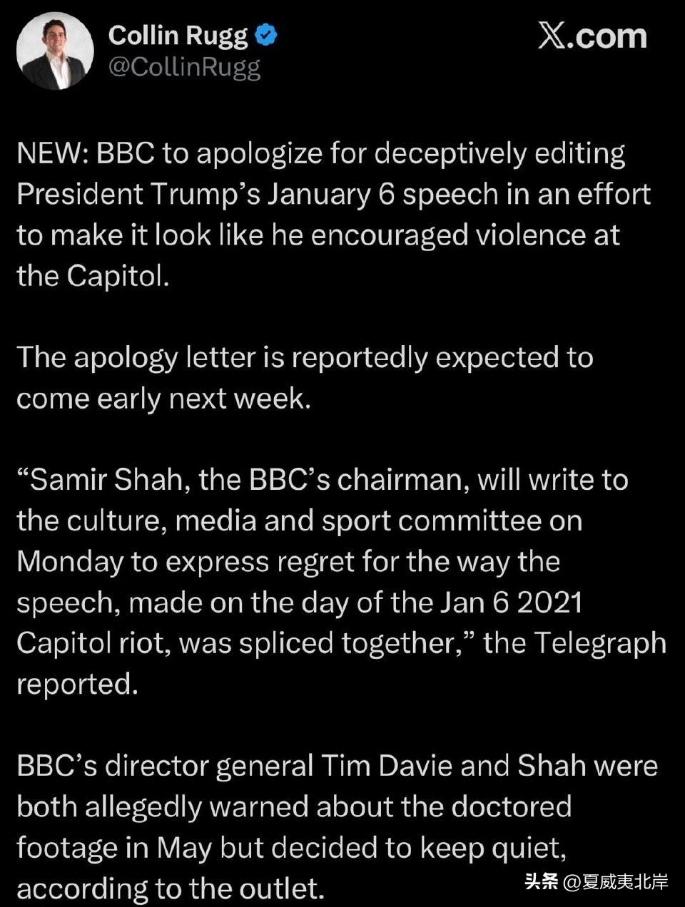 最新消息:BBC将为 deceptive editing(欺骗性剪辑)川普总统1月6日的演讲道歉,该剪辑试图让他看起来像是在鼓励国会山暴力事件。 据称,道歉信预计将于下周初发布。 “BBC主席Samir Shah将于周一写信给文化、媒体和体育委员会,对2021年1月6日国会山骚乱当天演讲的剪辑方式表示遗憾,”《每日电讯报》报道。 据称,BBC总裁Tim Davie和Shah早在5月就收到了有关该剪辑的警告,但选择保持沉默,据该媒体报道。