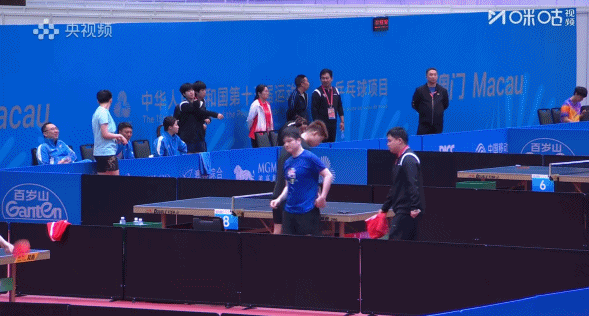 樊振东训练完在休息讨论,待会12:30迎来本届全运会男单项目首战,对阵周雨