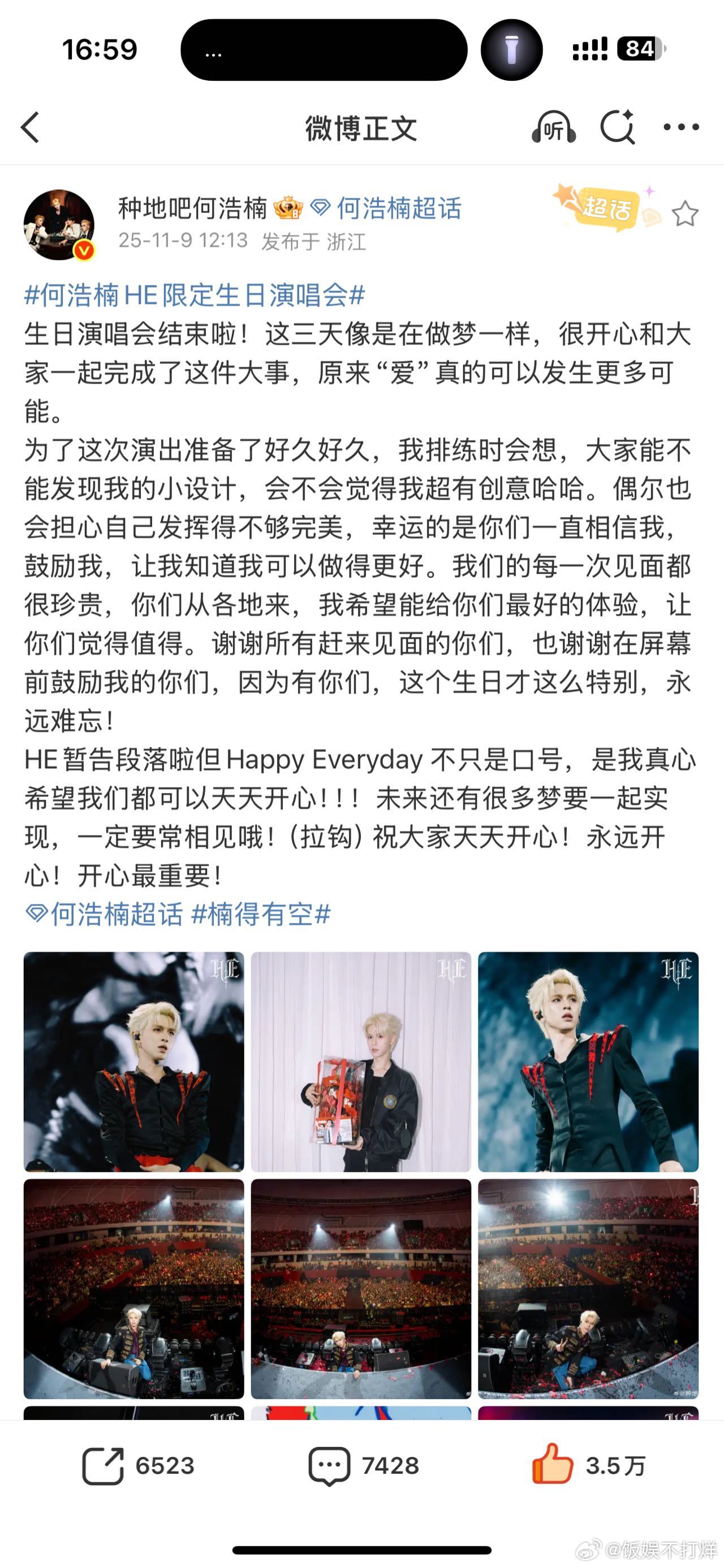 何浩楠生日限定的三天 在何浩楠生日限定的三天里,爱与梦想交织绽放!三天演唱会顺利结束,他在小作文中致谢从各地到杭州陪他过生日的粉丝,珍惜每次相聚,拉钩约定未来常相伴,一起逐梦前行! ​​​