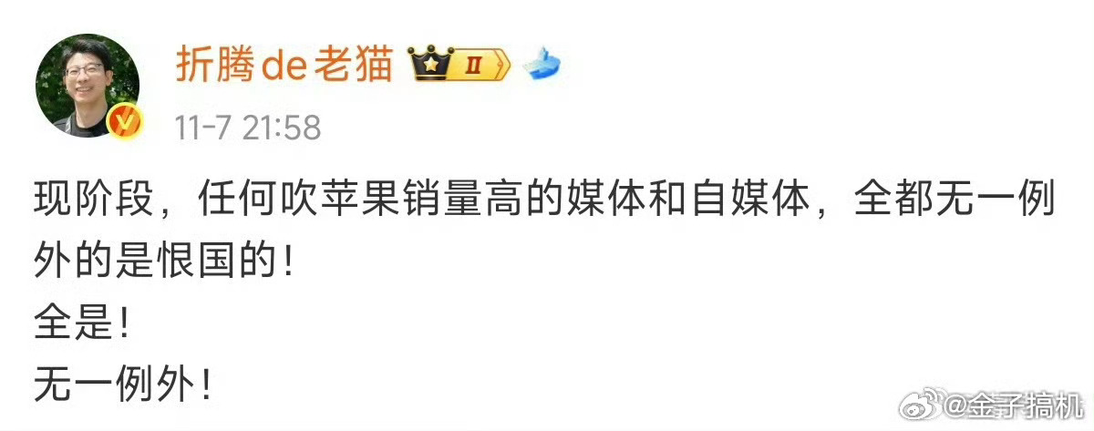 老猫被禁言,是不是跟之前那个关于苹果销量的逆天言论有关?明显的宣扬仇恨,给别人泼脏水扣帽子,可见这人真是一点都不改啊,内心是相当的偏激…