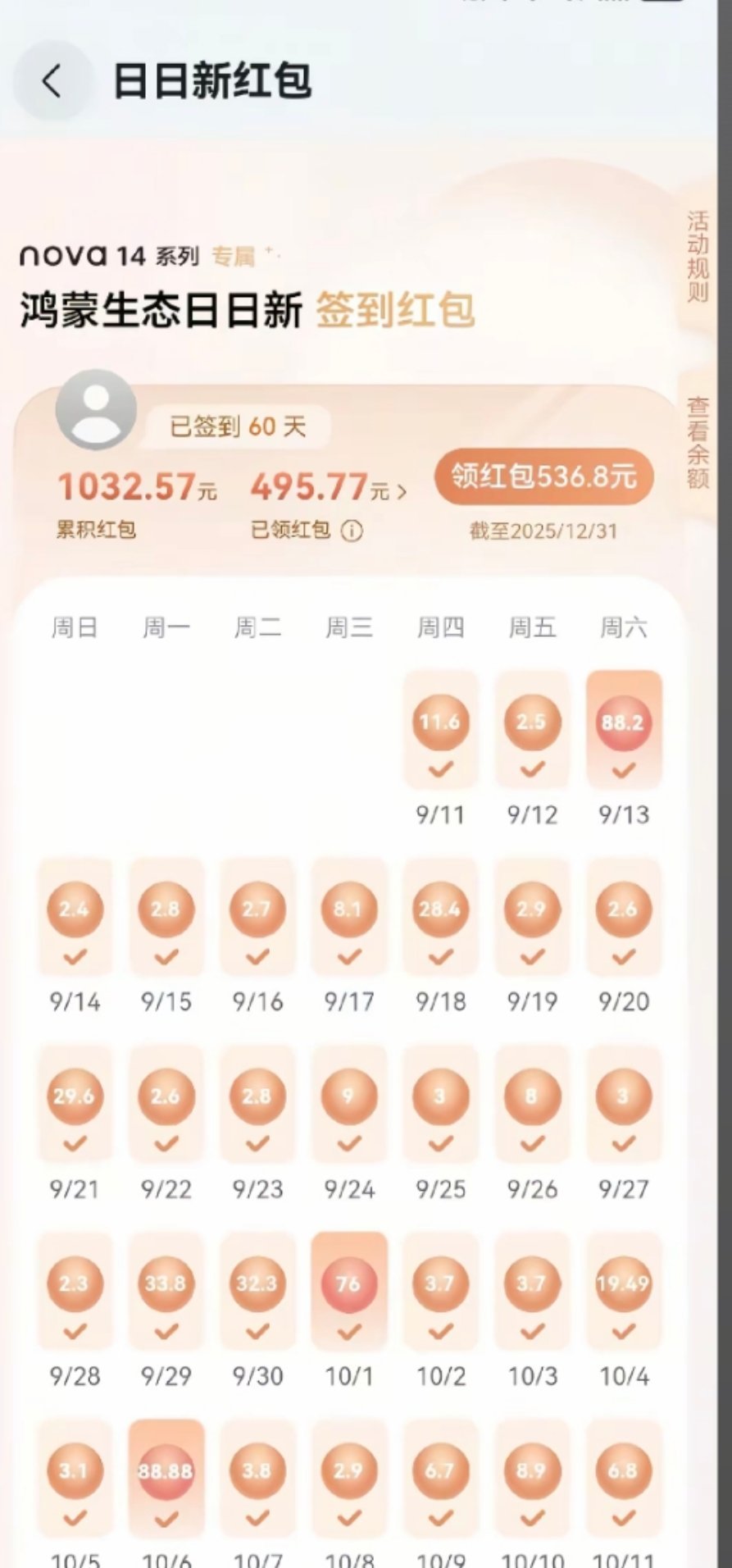 欧皇出现了,网友晒图,华为日日新红包干到1000的啊,好几个七八十的,手机一半钱都回来了[允悲]。