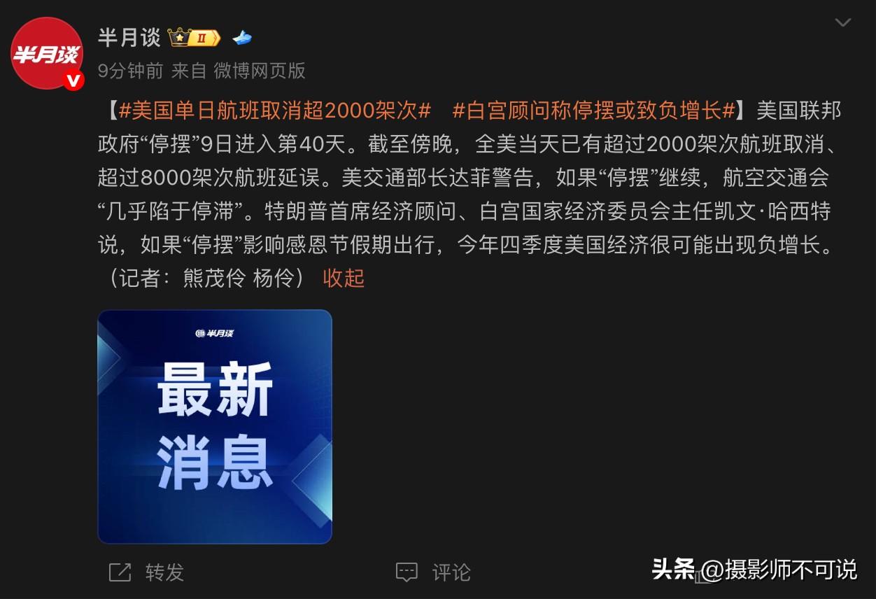 美国单日取消航班超2000架次,延误超8000架次这个太不可思议了。您可能只知道这个数据很庞大,但还不知道究竟有多庞大?我特意去查了一下美国相关航班的数据(未必可靠),全美每天客运航班架次约26000,也就是说取消航班率达到了百分之七以上,而延误航班比例差不多达到了恐怖的百分之三十,二者加起来就更恐怖了。恐怕这也是航空史上的奇观之一了,这对经济活动的打击是难以想象的。所以,有相关人士预测,如果停摆继续下去,第四季度美国经济增速将减半。所以,我认为政府停摆也算挺有趣的了![捂脸]美国航班大停摆