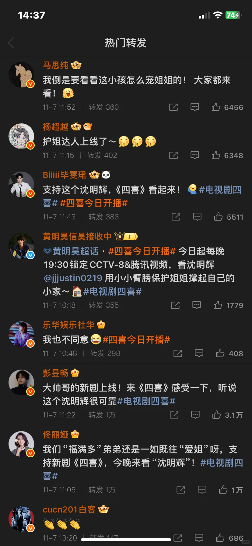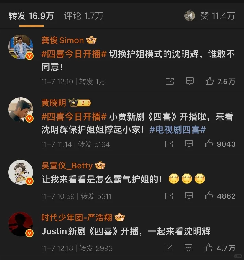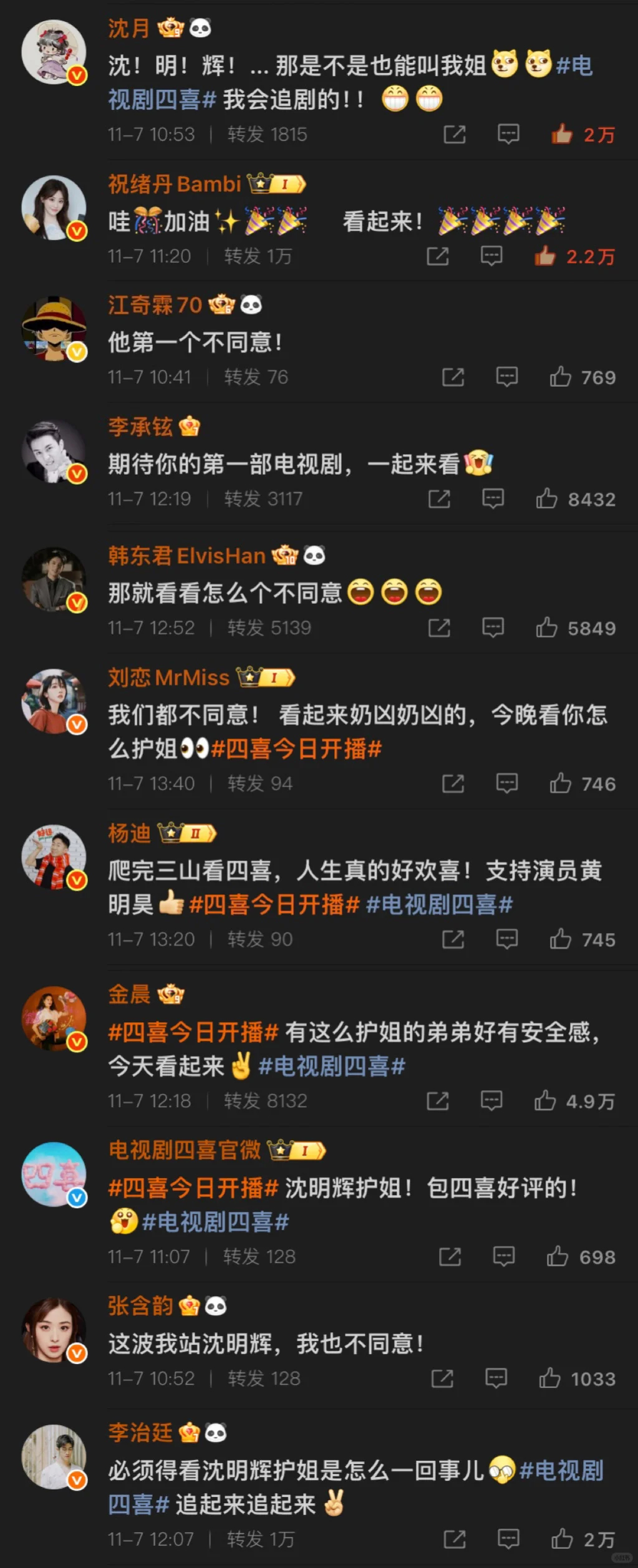 黄明昊的人缘怎么能好成这样 黄明昊的转发区好多人啊!黄明昊的新剧电视剧四喜 今晚开播,圈内好友轮番为小贾打call,我说黄明昊这人缘真太好了吧!我也已经搬好小板凳,坐等今晚四喜开播看明辉护姐啦~