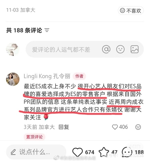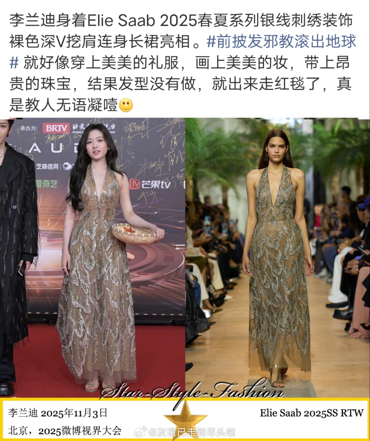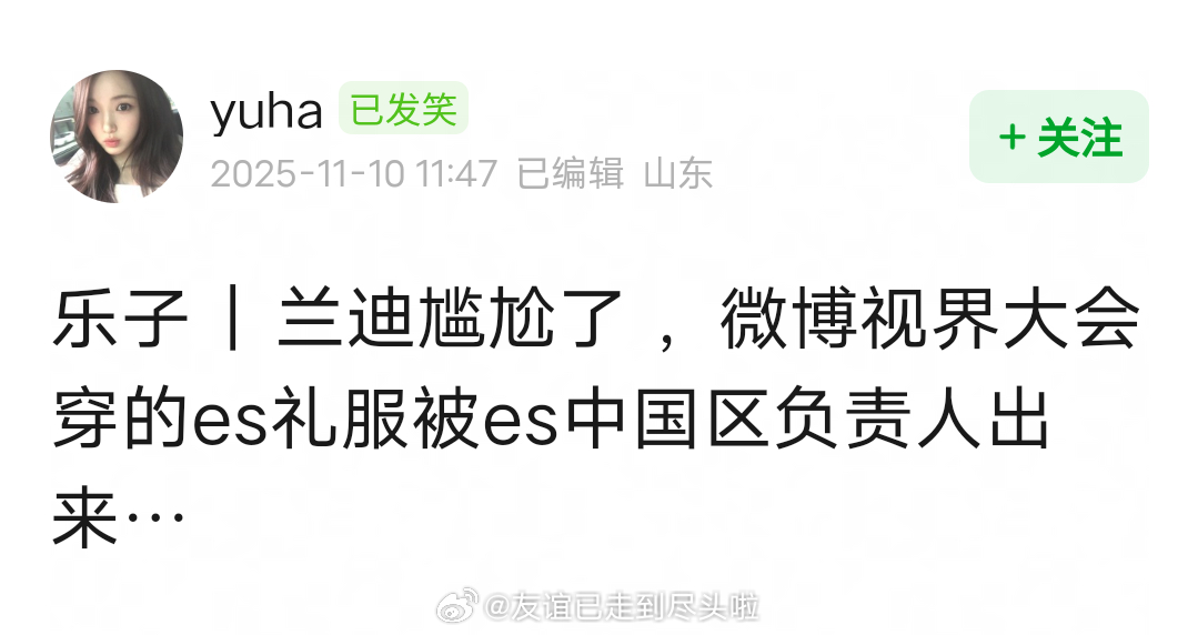 微博视界大会红毯,李兰迪穿的es礼服被es中国区负责人锤了非品牌支持,还说感谢艺人朋友选择成为es的零售客户。