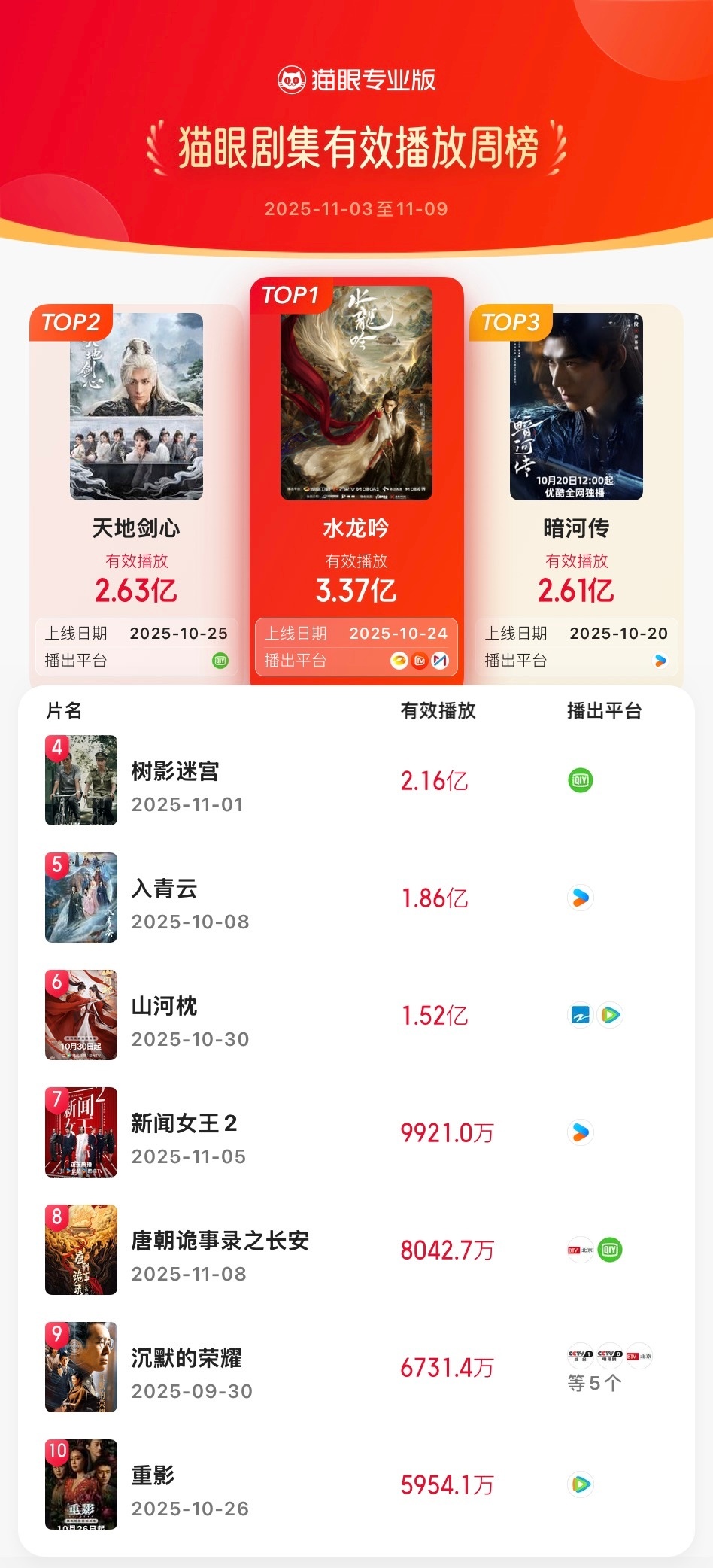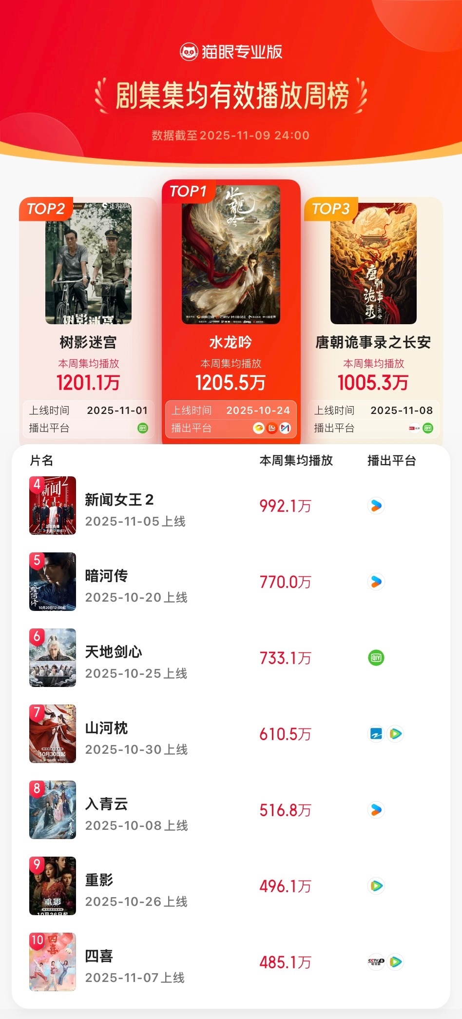 电视剧水龙吟官方[超话]水龙吟双榜登顶 据猫眼专业版数据,(按演员姓氏首字母排名)领衔主演的网络剧《水龙吟》登顶猫眼剧集有效播放周榜、剧集集均有效播放周榜,双榜登顶!
