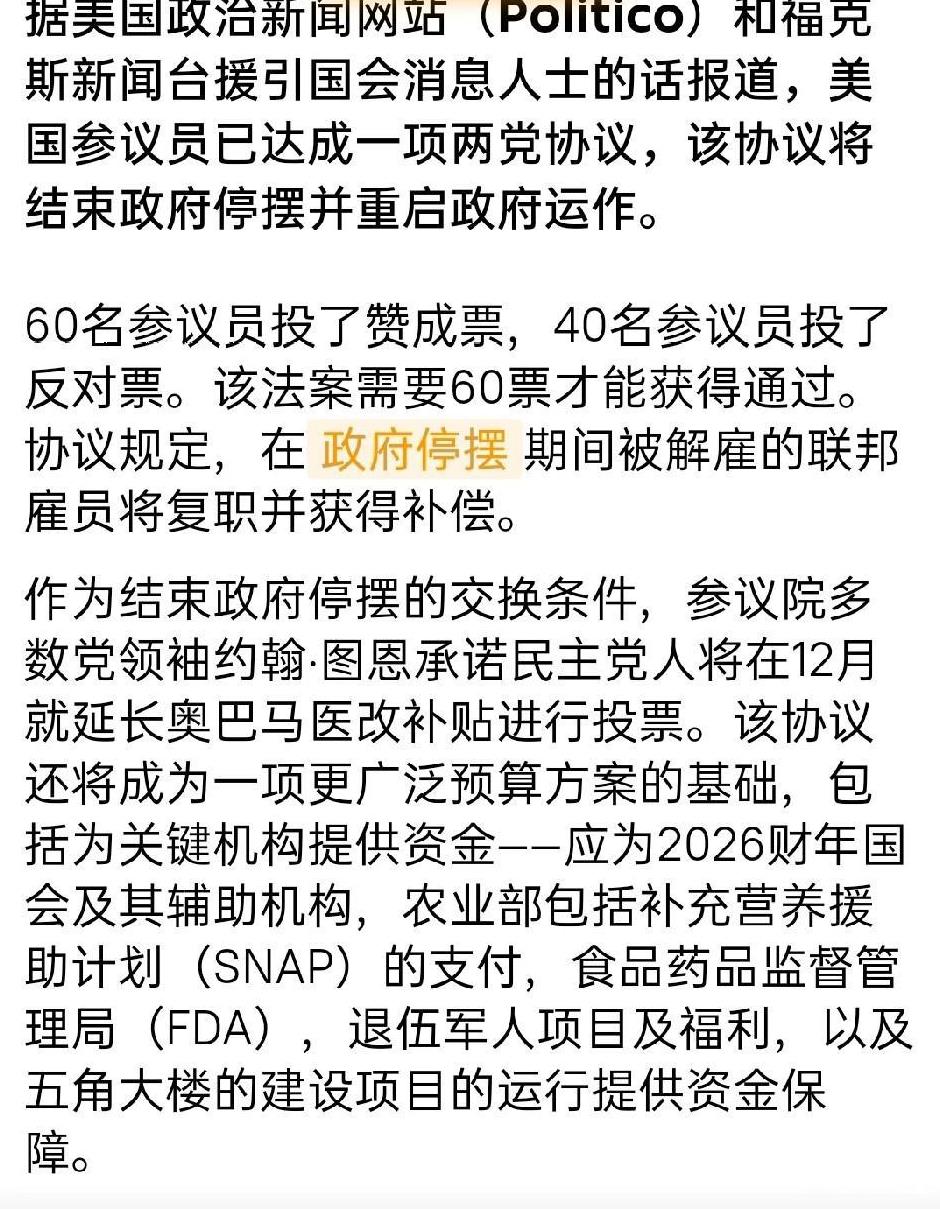 快讯!美国政府“停摆”结束!特朗普赢了面子输了里子! 全球瞩目的美国政府“停摆”今天正式结束,因为在特朗普的压力下,美国共和党和民主党两党参议员在最新一轮在参议院投票活动中,终于投出了60:40最低赞成票比例,完成了美国宪法规定的最低需要60票赞成才能通过决议的规定。从目前所公开的两党谈判信息内容看(见附图二内容),特朗普是赢了面子输了里子,因为虽然此时此刻民主党配合特朗普不再一味强调坚持将医保拨款与政府预算拨款捆绑在一起,却得到了特朗普政府12月份重新投票,且加大拨款范围的承诺。不仅如此,民主党用数名议员投赞成票让特朗普政府拨款预算方案刚刚通过的方式也警告了特朗普,美国民主党拥有左右美国政局的能力,他们的让步是有限的,特朗普不可为所欲为。综上所述可以看出,在美国人民用选票重新将民主党抬起来的现状下,特朗普畏惧了,从此以后,他应该会有所收敛吧!