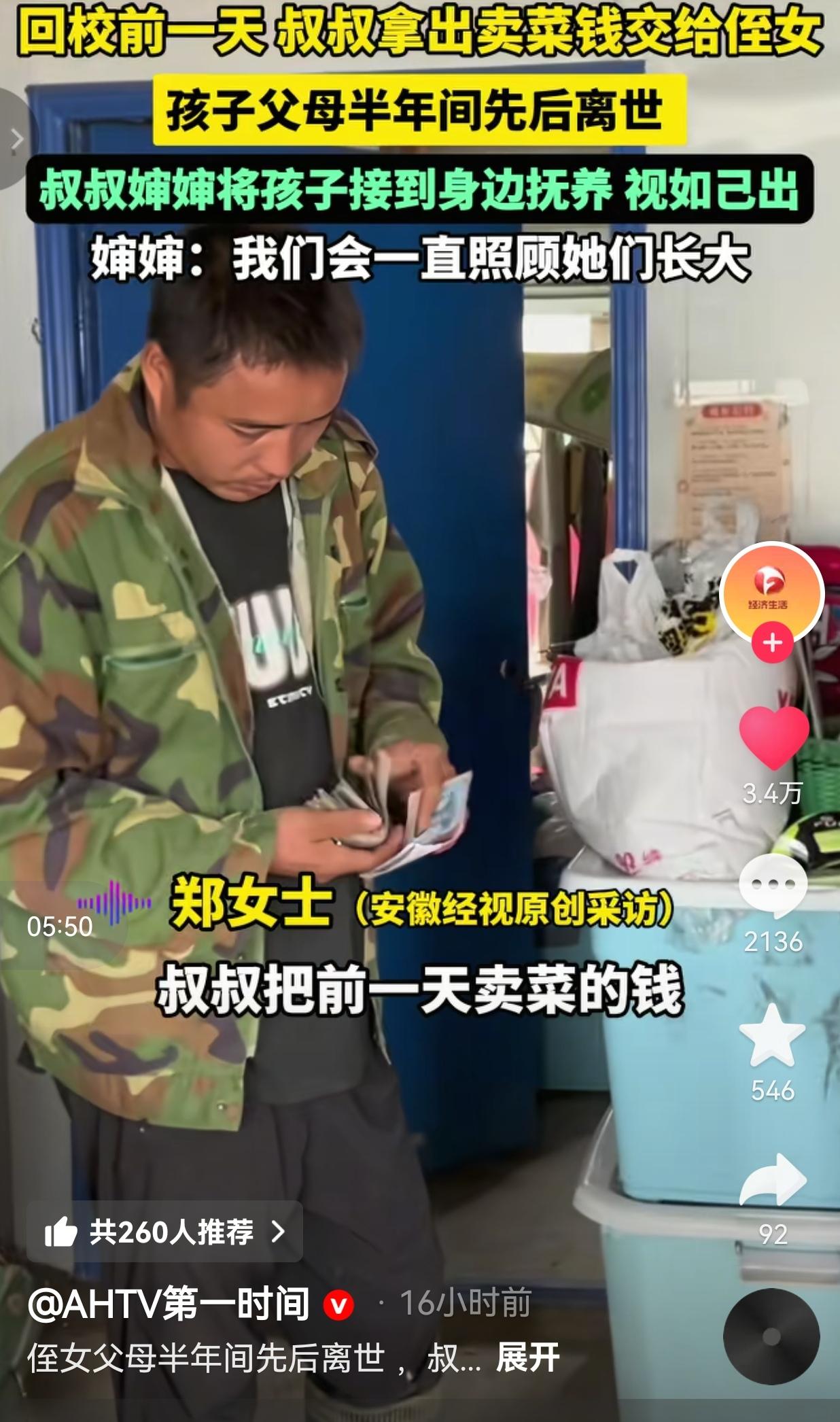 叔叔婶婶太好了!侄女回校前一天,叔叔拿出卖菜钱交到侄女的手上,自己只留了20多块钱,留作第二天的卖菜找零用,其他的100多元全部都给了侄女。 为什么叔叔对侄女这么好呢?据婶婶讲述,侄女也是也是一个可怜人,2020年下半年至2021年上半年,短短的半年时间里,侄女的父母相继去世。只留下姊妹俩相依为命。 那个时候,孩子都很小,一个上小学,一个上初中,父母的去世对孩子的打击很大。 为了给姊妹俩一个完整的家,让她们感受到家人的关爱,叔叔婶婶经过商议,一致决定将两个侄女接到身边一起抚养。 五年来,叔叔婶婶对两个侄女视如己出,每个月🈶200块钱的零花钱,而且,无论两个侄女遇到什么事情,叔叔婶婶都会全力支持。 婶婶说:“虽然养这么多孩子有点吃力,但是,我们夫妻俩一定把两个侄女照顾好,直到她们长大成人。” 网友看到后评论说,侄女 遇见了一个得好婶婶,一个好叔叔,这才是真一家人,古话真没错,大难之时见真情,叔养侄女。 还有的网友说,兄嫂不在了,叔叔担当理所当然,因为血脉至亲,即使付出生命来照顾也是应该!但婶婶能无怨无悔实在是大爱之人!所以,婶婶是个好人。 两个孩子是不幸的,这么小就遭遇父母双亡,这么大的家庭变故。然而,孩子又是幸运的,因为她们遇到了天下最好的叔叔婶婶,她们用自己的双手,为两个侄女托起了一个家。 自此以后,孩子虽然失去了父爱母爱,但是,叔叔婶婶给孩子的爱,一点也不比父母少。这就是血浓于水的骨肉至亲! 希望两个侄女长大后,以后有本事了,把叔叔婶婶当成自己的亲生父母一样看待,也不枉费她们夫妻俩的精心照顾。 针对此事,你有何看法?欢迎大家评论区讨论留言。