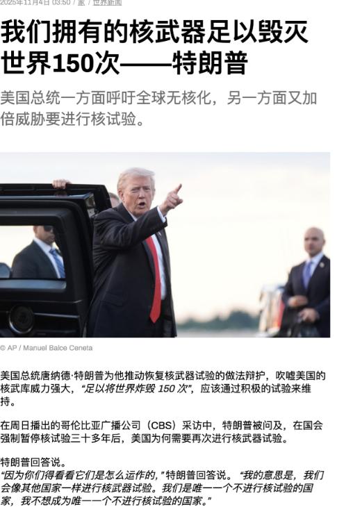 特朗普说美国拥有的核武器足以毁灭世界150次,那么问题来了:在第一次毁灭世界后,谁来毁灭第二次?   特朗普说的“150次”,其实就是个“吹牛大赛”的冠军奖杯,根据瑞典研究所的数据,美国现在有1770枚核弹头,俄罗斯1710枚,两国加起来占了全球90%的核武器。   而“炸一次地球”需要多少当量?国际上公认是5000万吨TNT,相当于把广岛原子弹的威力放大3300倍。   按这个算,美国现有的核武器炸地球十几次都绰绰有余,但特朗普非要说“150次”,就像有人非说“我家有150辆自行车,能绕地球150圈”,其实家里就一辆破车,连小区都绕不出去。   更搞笑的是,特朗普一边吹牛,一边又说“我不想承认美国是第一核大国,因为这太吓人了”,说白了,他就是想通过“核威胁”这招,让其他国家觉得“美国太厉害了,我们得听它的”,然后趁机让美国在核武器上占更多便宜。 特朗普不光吹牛,还说要重启核试验,理由是“俄罗斯和其他国家都在搞核试验”。   但这话刚说完就被打脸了:俄罗斯上一次搞核爆炸还是30多年前的事,最近他们测试的“海燕”核动力导弹和“波塞冬”核动力潜艇,都是运载工具,根本没爆炸;中国更是严格遵守《全面禁止核试验条约》,从来没搞过核爆炸。   美国能源部长赶紧出来圆场,说重启核试验只是“系统测试”核武器部件,不搞真爆炸,但国际社会根本不买账。   联合国秘书长警告,任何核试验都可能引发无法控制的后果,俄罗斯总统普京更是直接放话,美国要是敢重启核试验,俄罗斯肯定对等反制。 更可怕的是,美国这么干可能引发新一轮核军备竞赛,英国《金融时报》说,如果美国重启核试验,俄罗斯、印度、巴基斯坦这些国家可能会跟着升级核技术,甚至搞出一些“擦边球”武器,到时候全球战略稳定就彻底崩了。   而美国自己也会陷入尴尬:他们冷战时期搞的超级计算机模拟系统已经很厉害了,重启核试验反而可能让技术优势变弱,就像“为了和对手比谁更疯,自己先把自己搞疯了”。 核武器的本质是“吓唬人”,而不是“比谁炸得多”,有炸一次地球的能力,就足够让任何国家不敢轻举妄动;但非要追求“炸150次”的能力,只会让人类陷入“你炸我,我炸你”的死循环。   特朗普的言论,暴露了美国核战略的短视和自私,他们既不想承担核裁军的责任,又想通过核威胁维持霸权,最后只会让全球核安全体系崩塌,让人类文明暴露在核战争的阴云之下。   在这个核时代,真正的智慧不是比谁核武器多,而是比谁更克制、更有责任感,就像联合国秘书长说的,力量不在于挑衅,而在于克制,如果美国继续沉迷于“150次毁灭”的荒唐逻辑,最后毁灭的,可能不只是地球,还有人类文明本身。