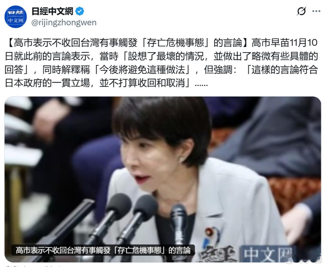 日经中文网:日本首相高市早苗表示不收回台湾有事触发「存亡危机事态」的言论。